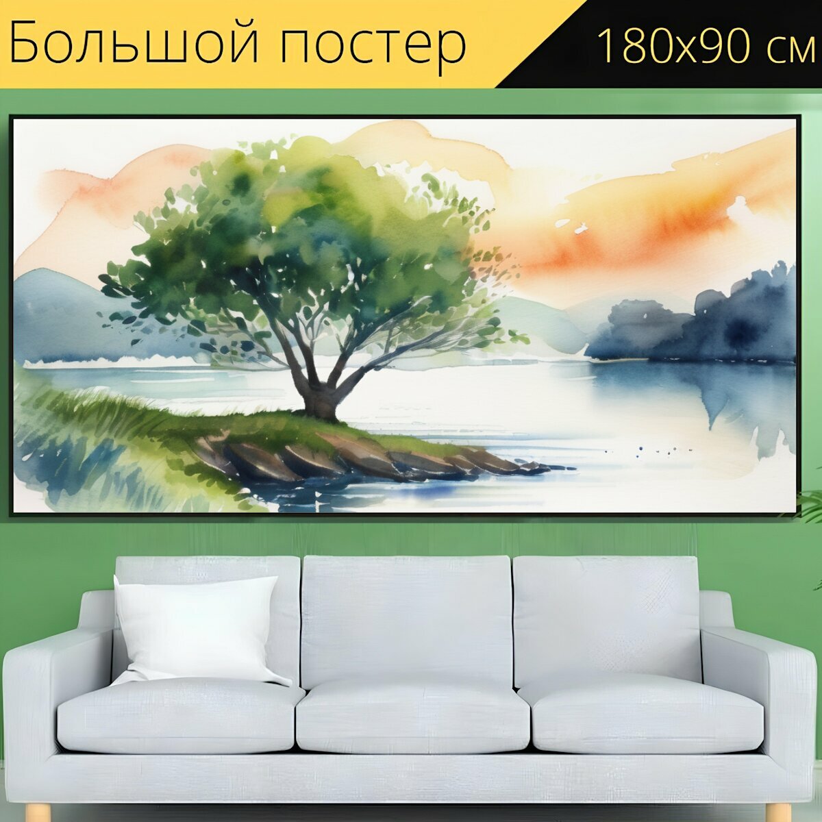 Большой постер "Река и дерево, в стиле акварель" 180 x 90 см. для интерьера на стену интересное: