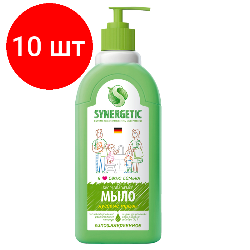 Купить Комплект 10 шт, Мыло жидкое Synergetic "Луговые травы", биоразлагаемое, с дозатором, 500мл