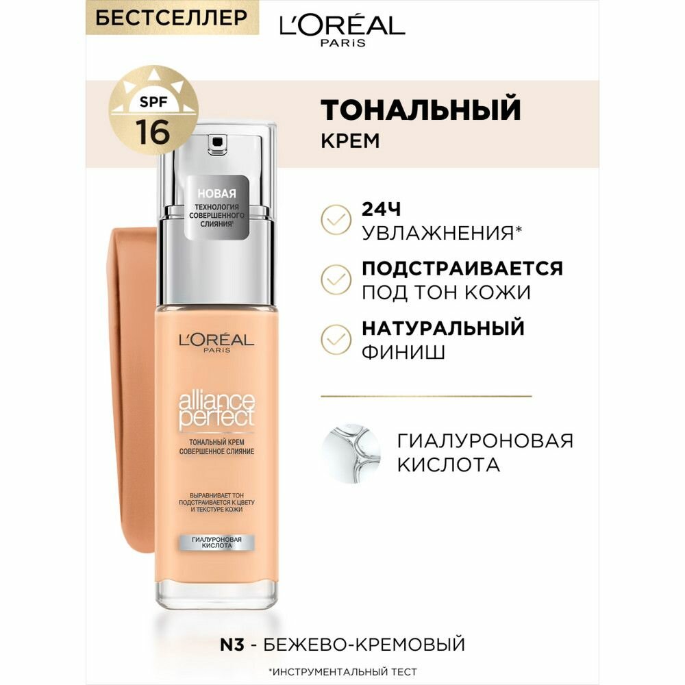 L'Oreal Paris, Тональный крем ALLIANCE PERFECT совершенное слияние обогащенный гиалуроновой кислотой, тон 3.D / 3.W, SPF 16, 30 мл