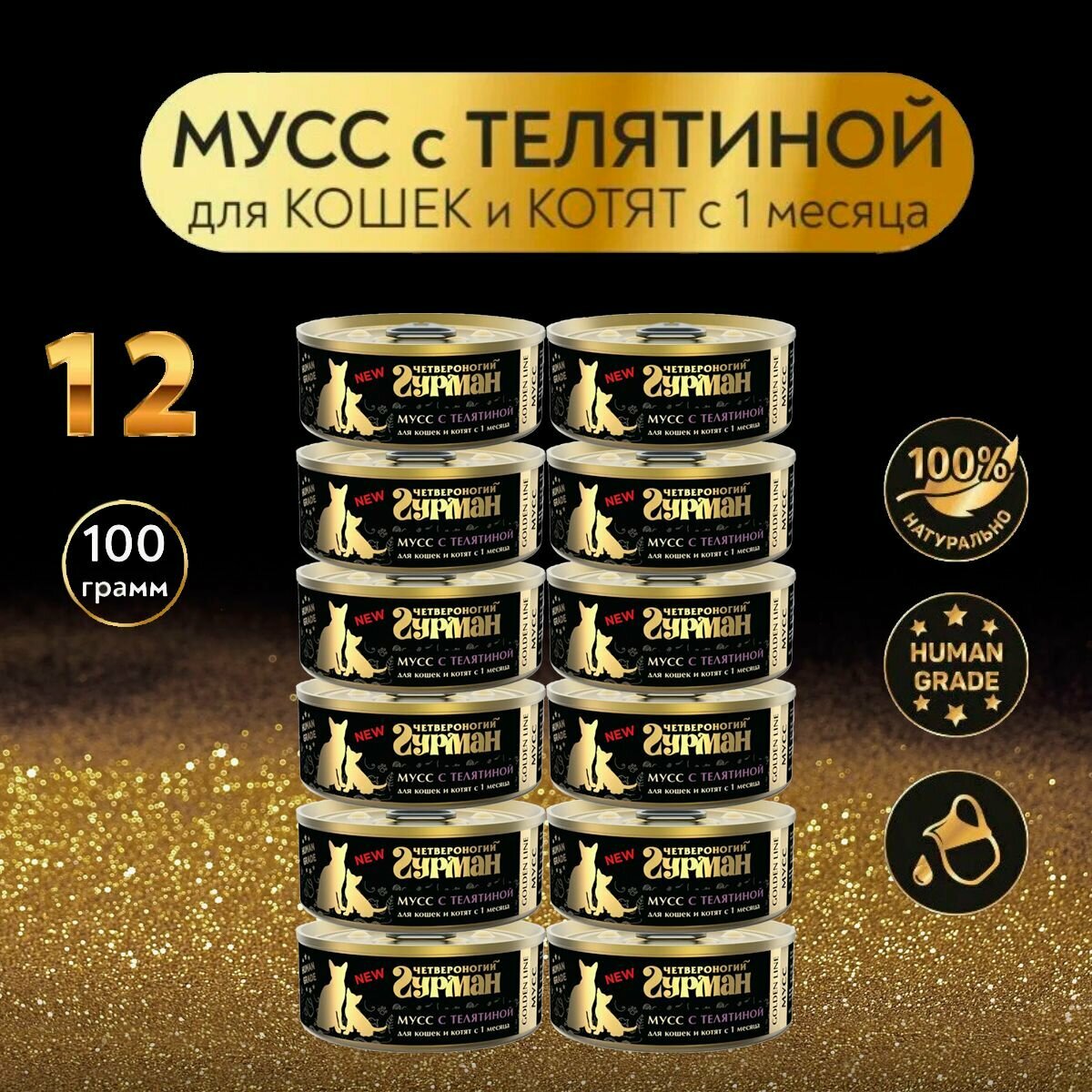 Четвероногий гурман GOLDEN LINE для кошек и котят мусс с телятиной банка 100 гр NEW 100 гр х 12 шт