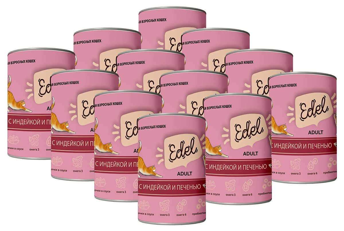 Консервы Edel, полнорационный, для кошек, нежные кусочки в соусе с индейкой и печенью (12шт x 400гр)