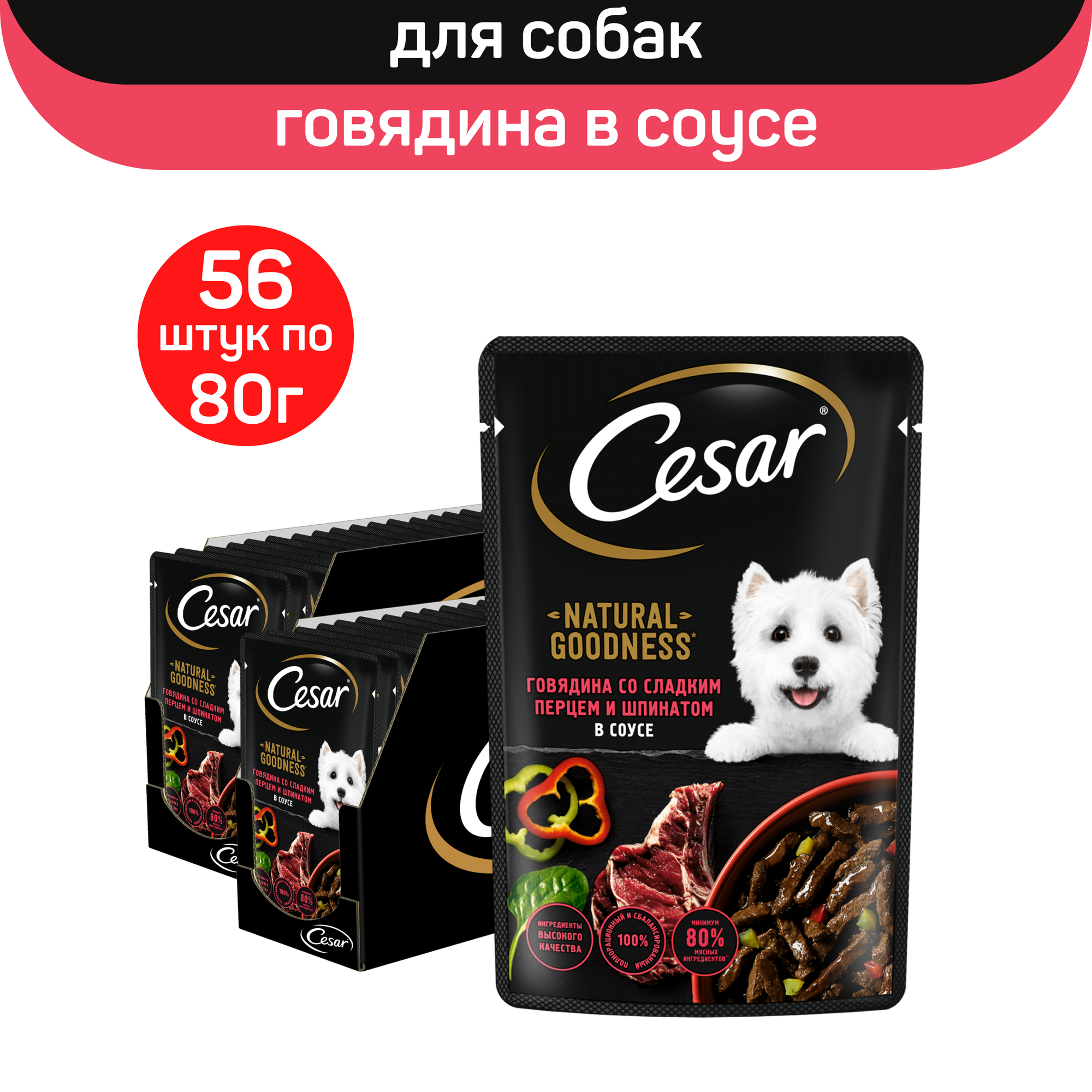 Купить Влажный корм Cesar Natural Goodness для взрослых собак, с говядиной, сладким перцем и шпинатом в соусе, 56 шт по 80 г