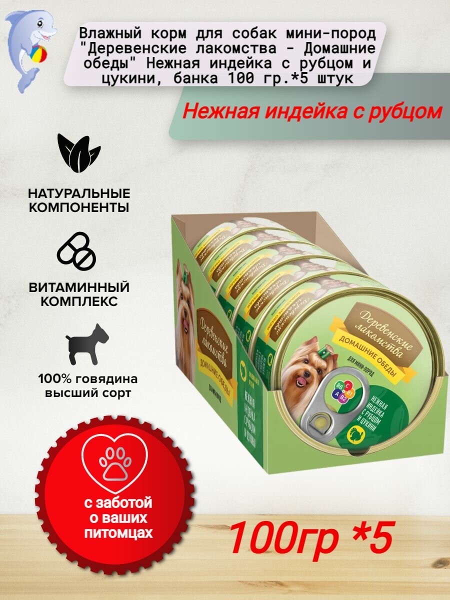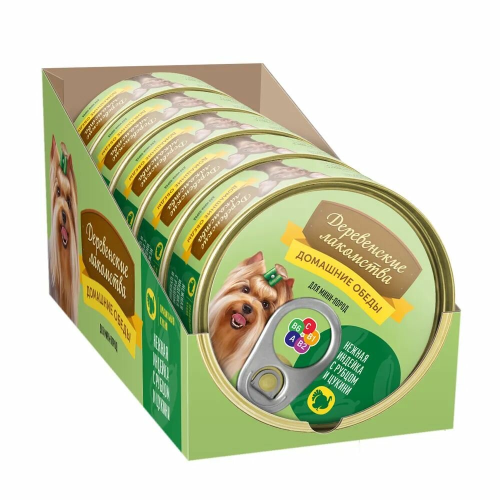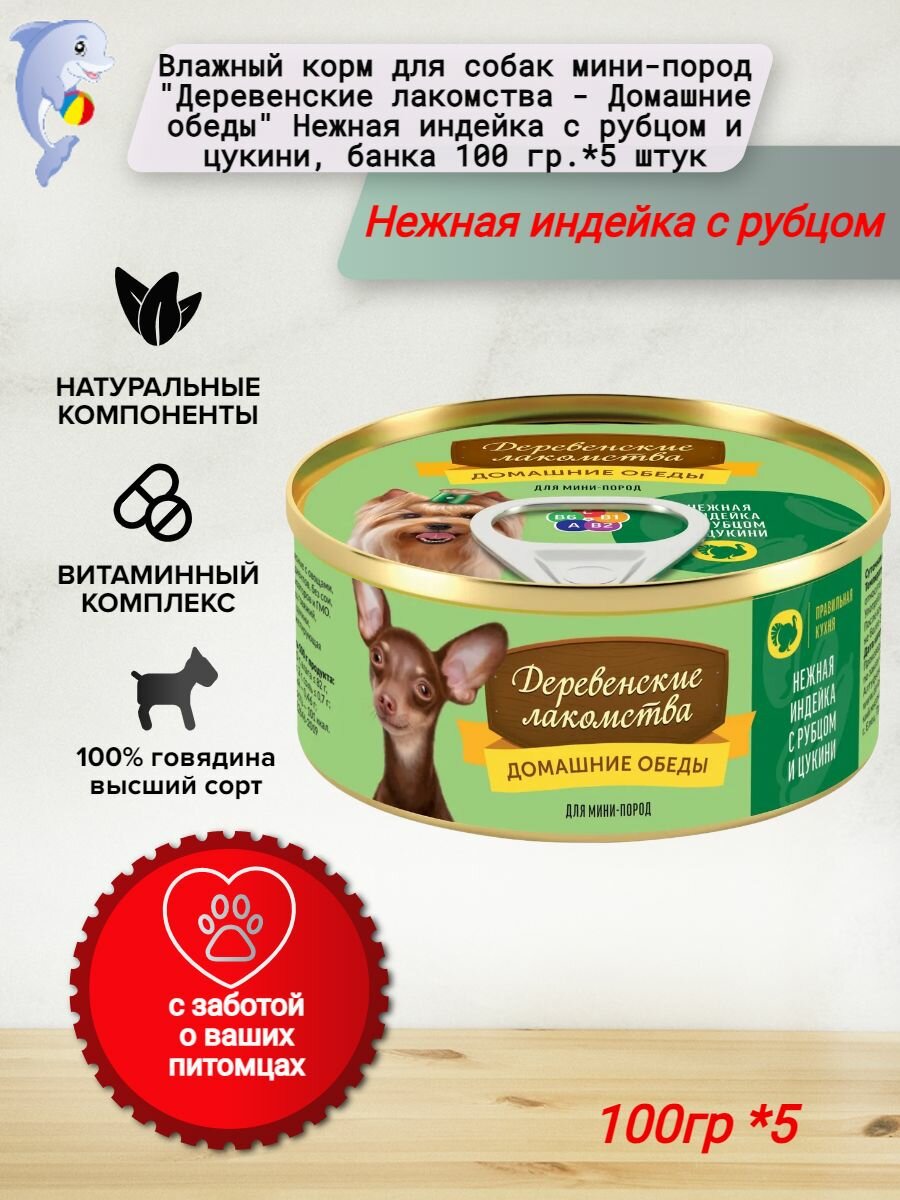 Влажный корм для собак мини-пород "Деревенские лакомства - Домашние обеды" Нежная индейка с рубцом и цукини, банка 100 гр.*5 штук