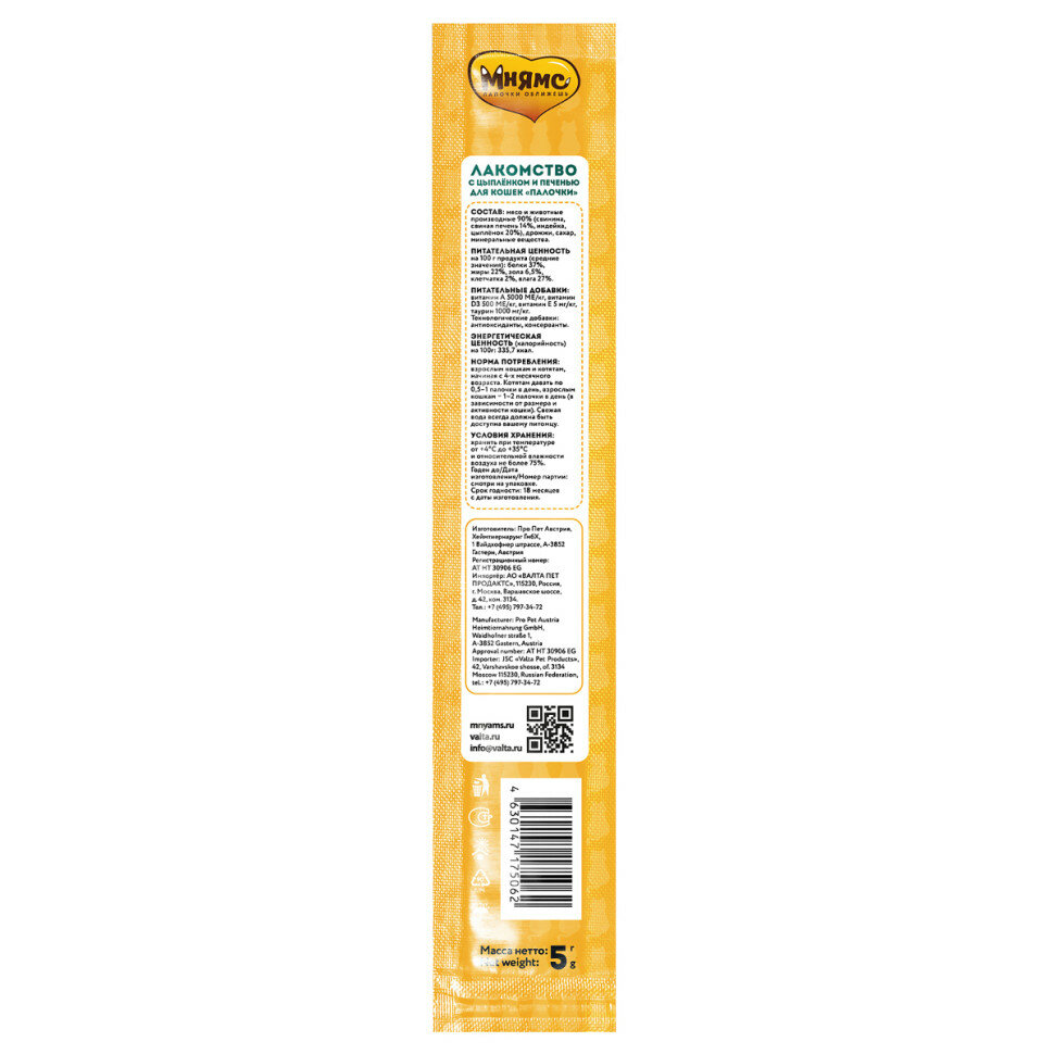 СохранитьЛакомство Мнямс лакомые палочки 13,5 см для кошек с цыпленком и печенью 5г х 10шт интересное: