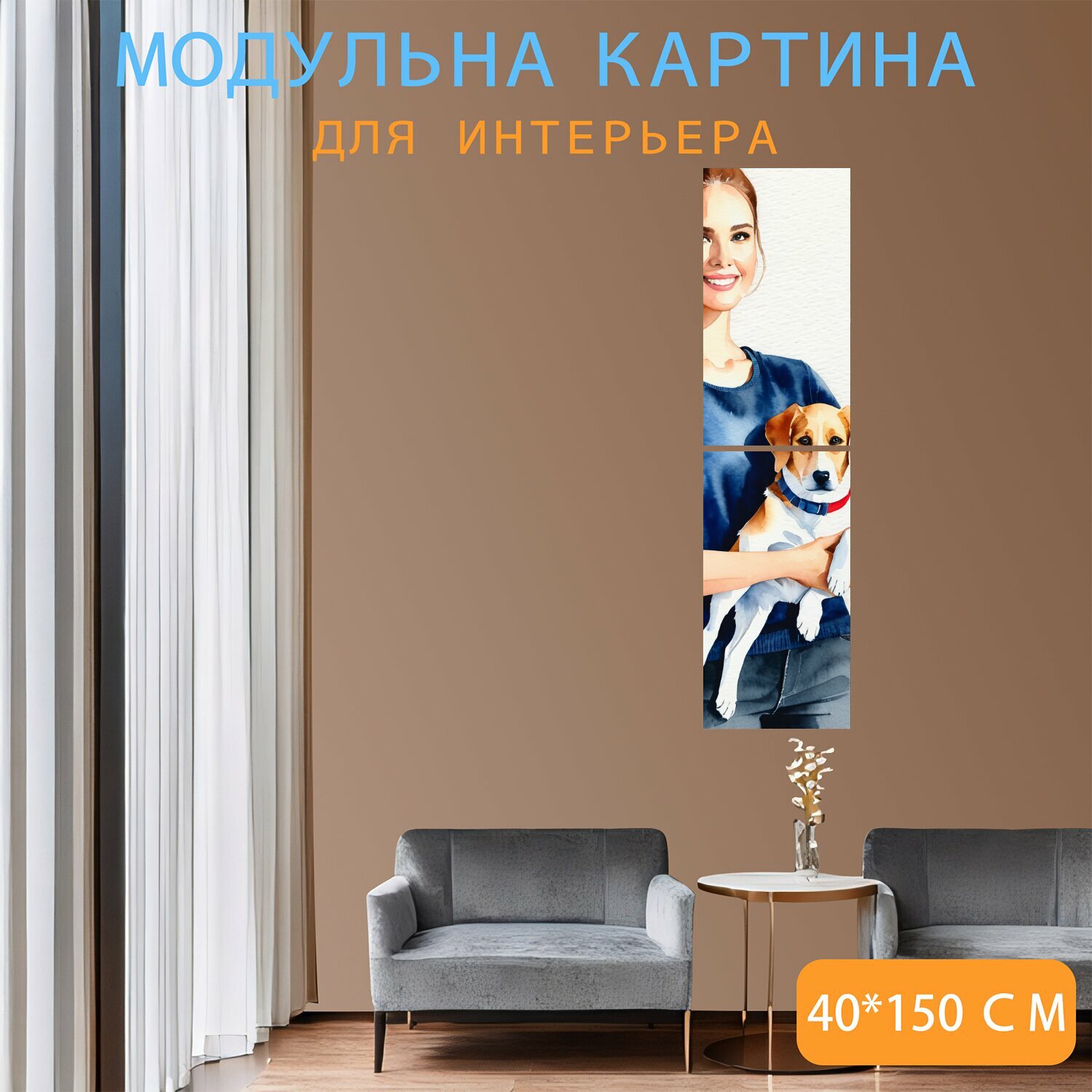 Купить Картина на холсте "Двое с собакой, в стиле акварель" на подрамнике 75х40 см. для интерьера
