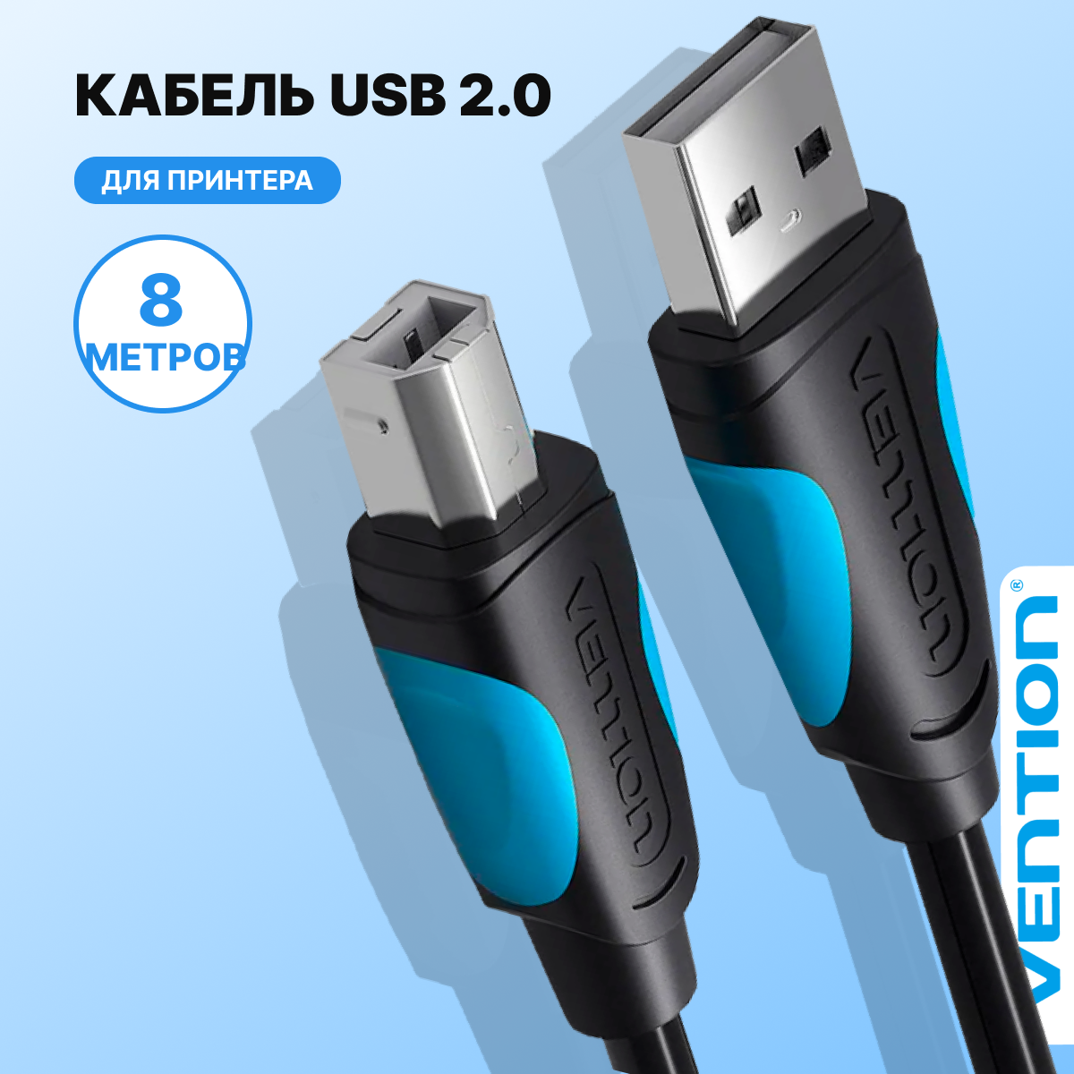 Кабель Vention USB 2.0 AM/BM - 8 м (VAS-A16-B800), Кабель Vention USB 2.0 AM/BM - 8м. Черный