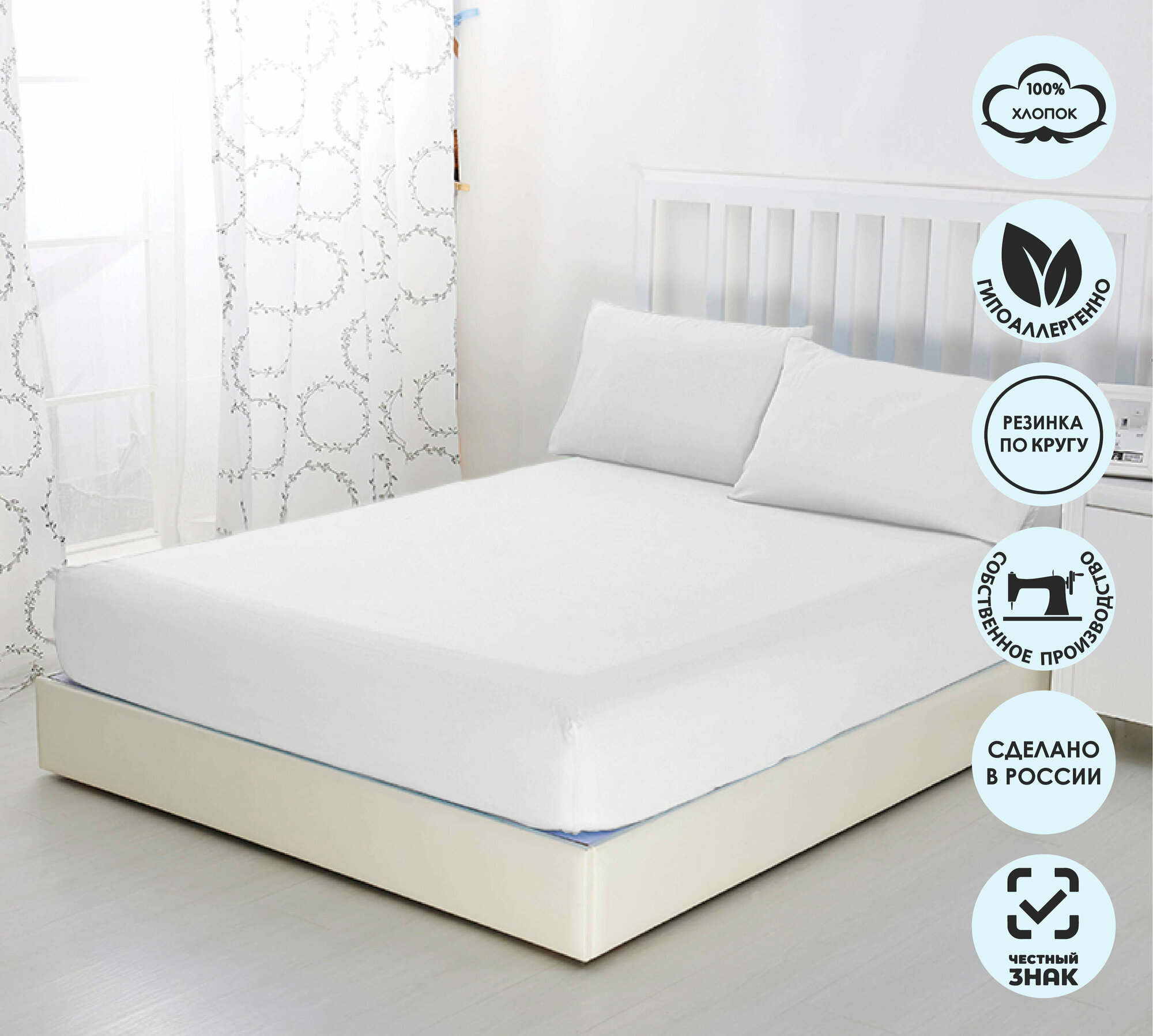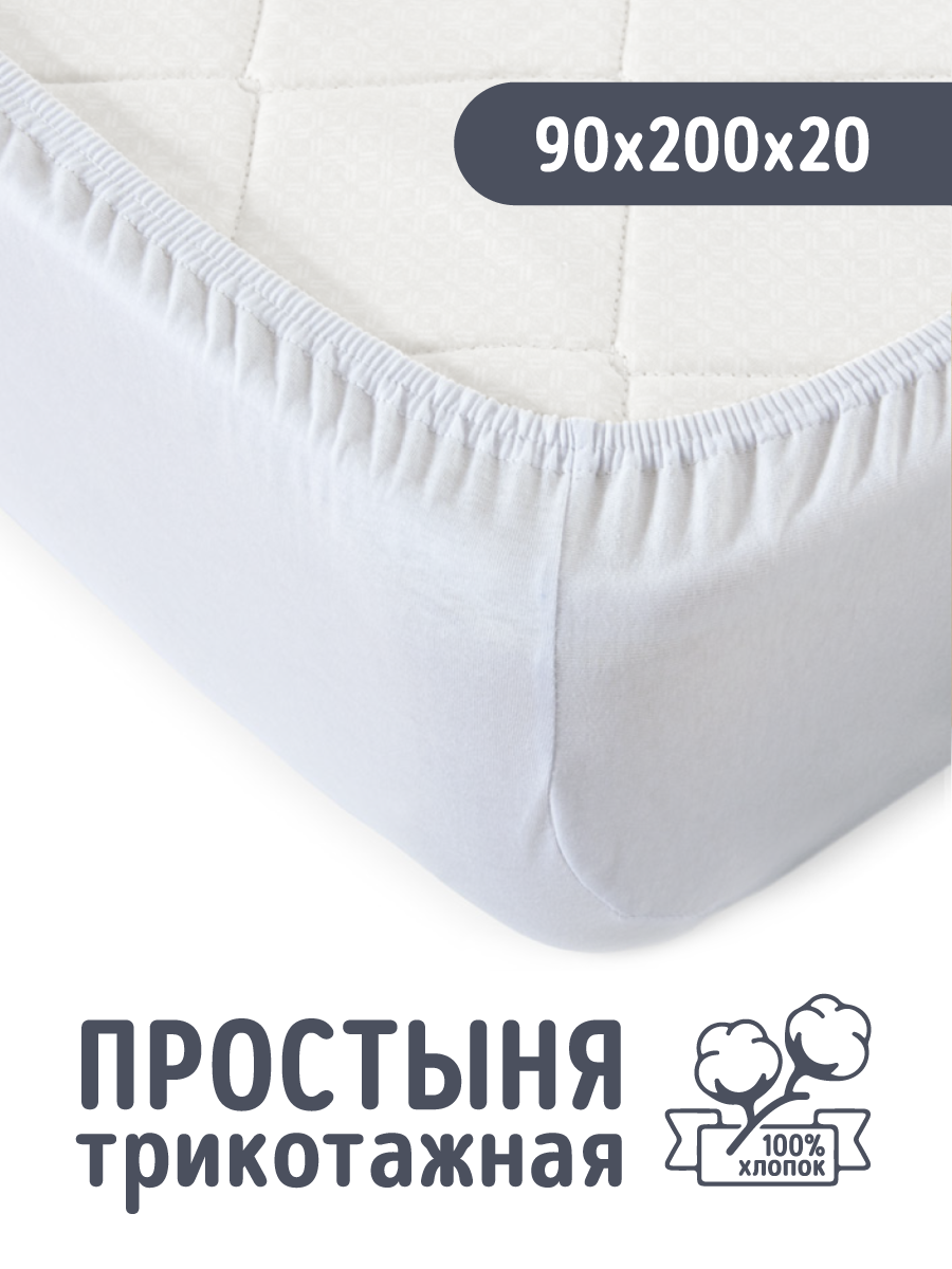 Простыня на резинке Белая, 90х200х20, трикотаж, 100% хлопок