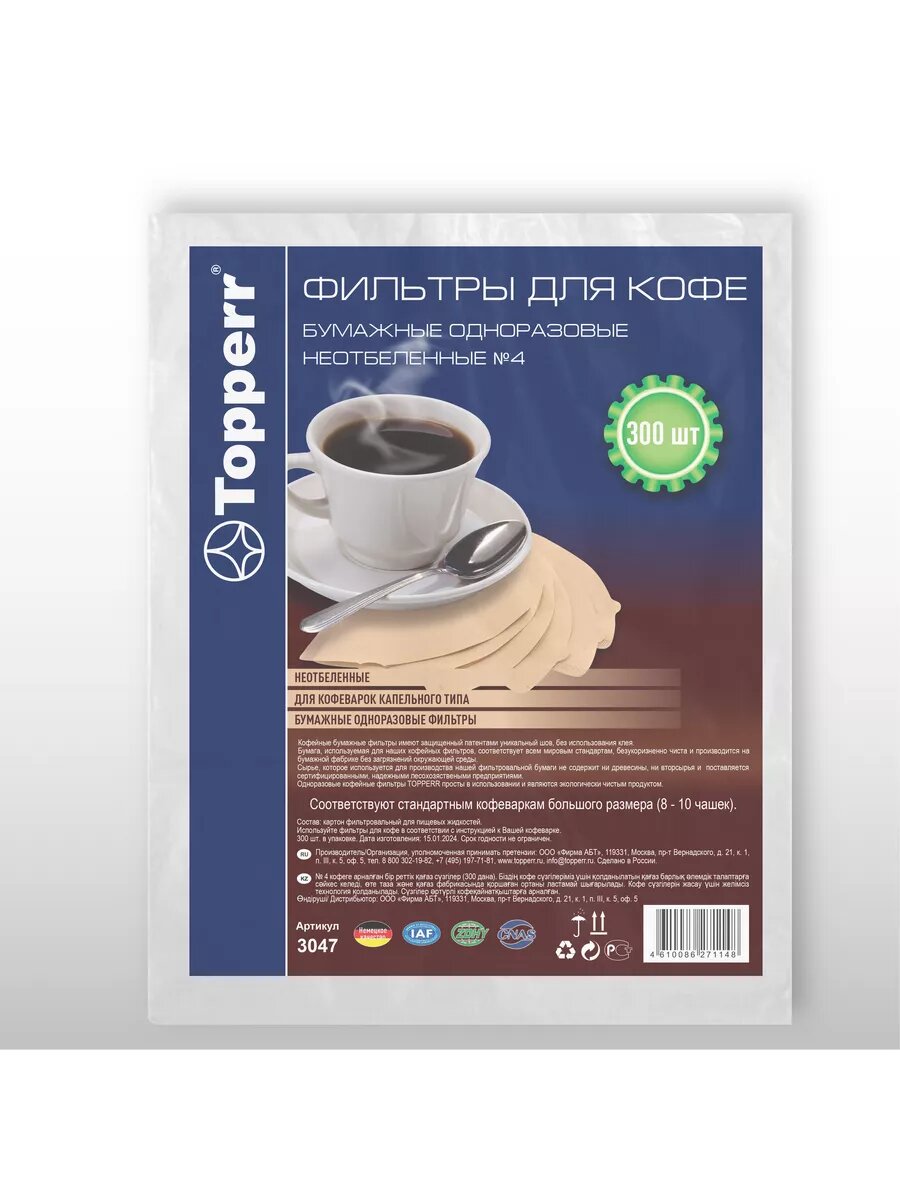 Topperr 3047 Фильтр бумажный для кофеварок 4 (300шт.), неотбеленный