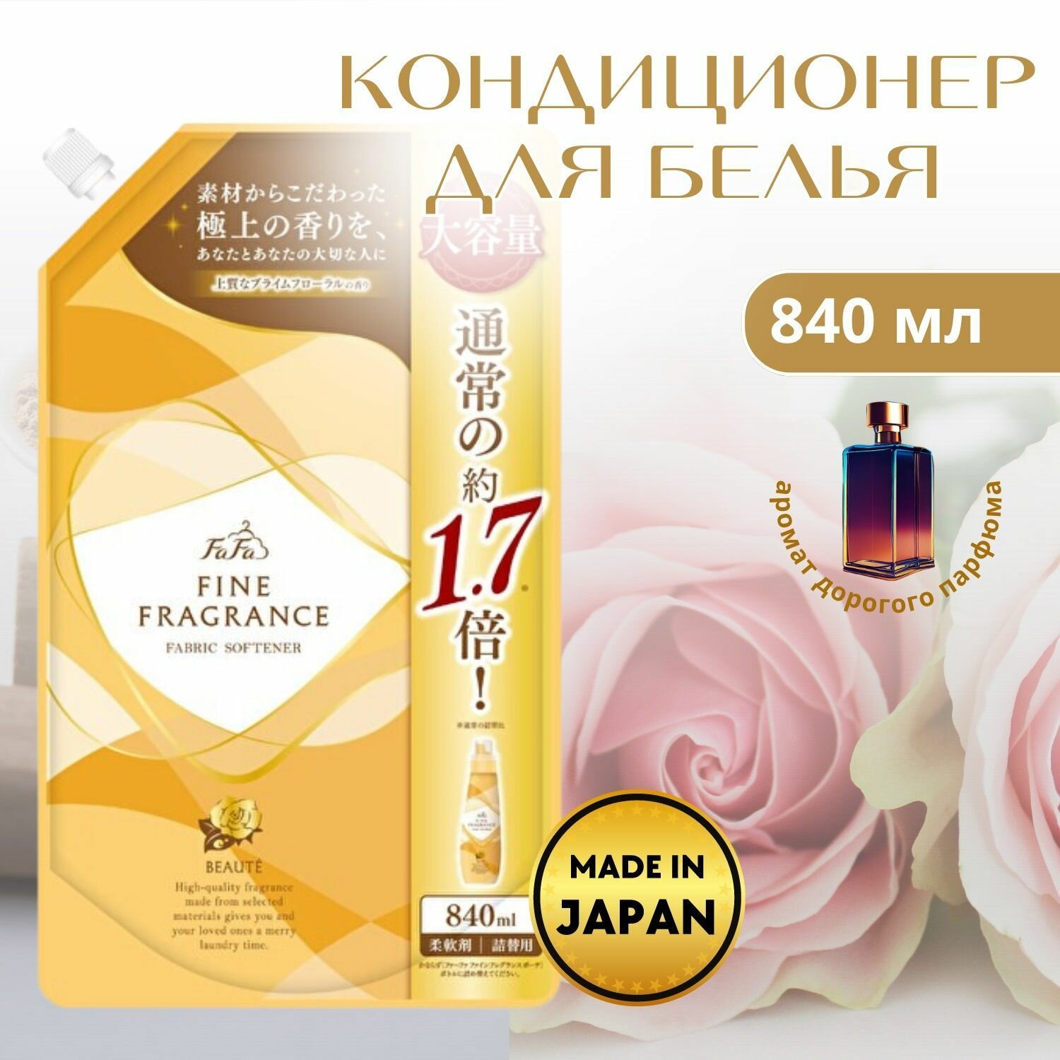 Nissan FaFa "Beaute" Японский антистатический кондиционер для белья с ароматом цветов, мускуса и сандалового дерева Fine Fragrance, 1440 мл. (м/у)