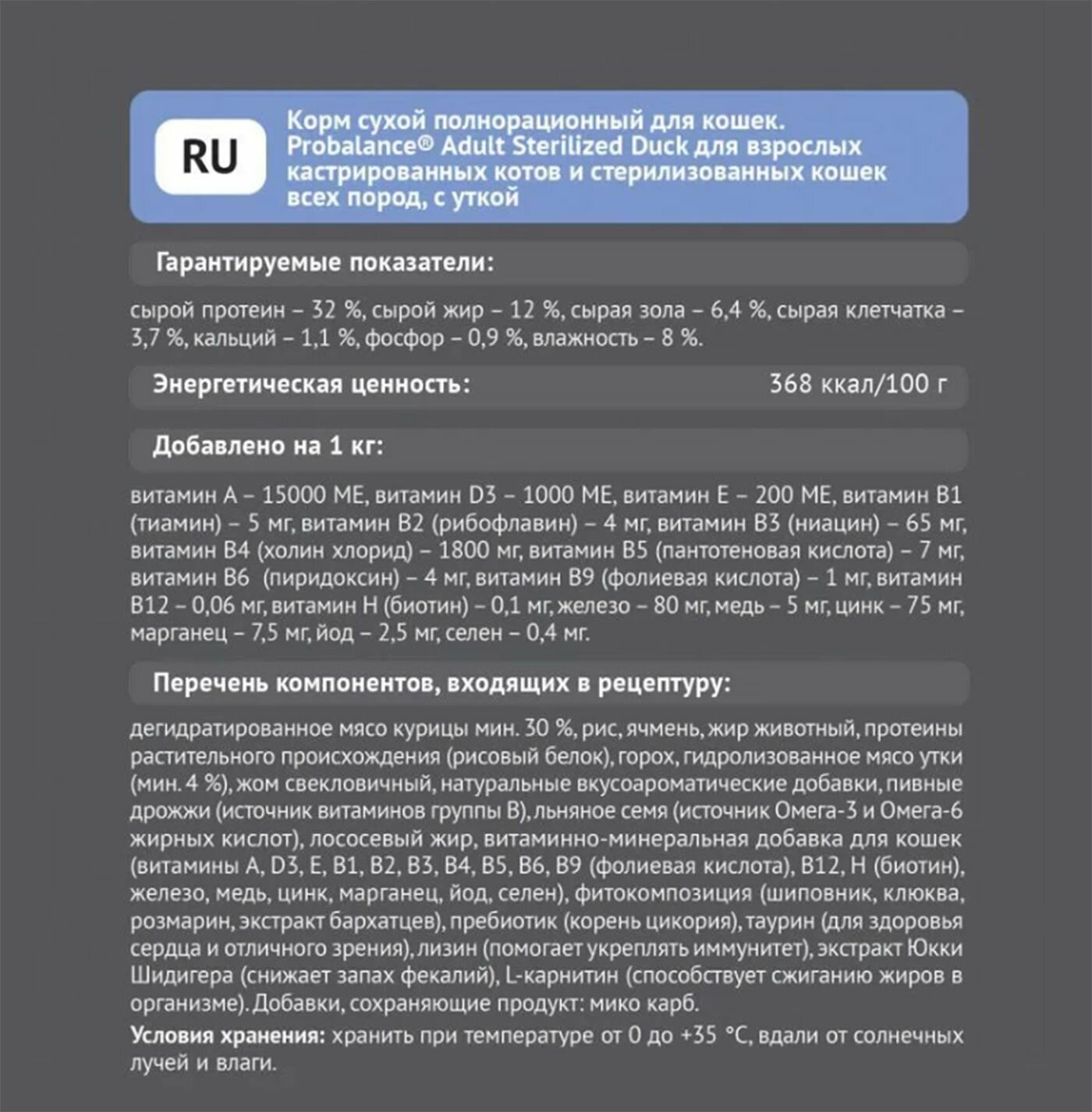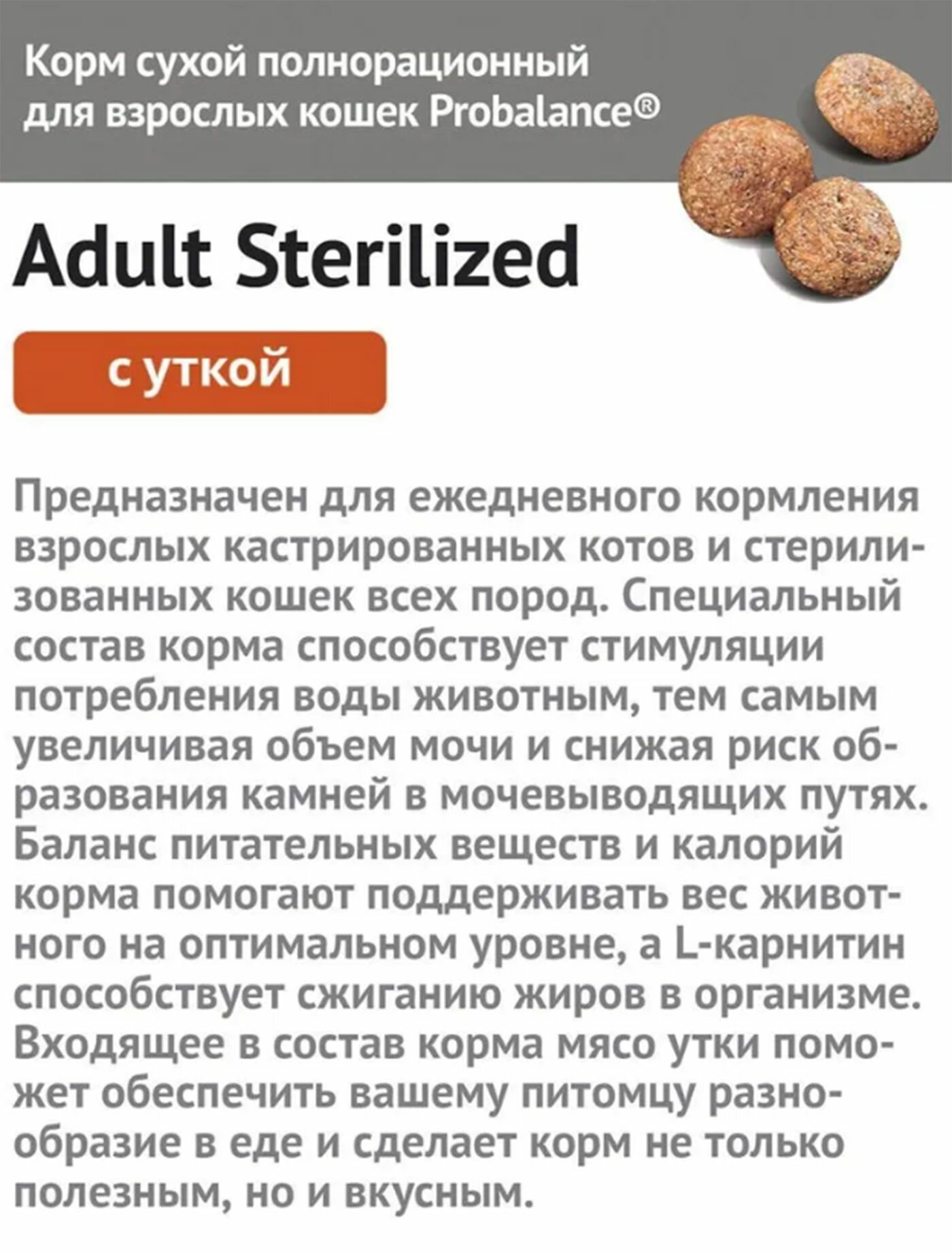 Купить Корм сухой Probalance Adult Sterilized Duck для стерилизованных кошек и кастрированных котов, с уткой, мешок 1,8 кг