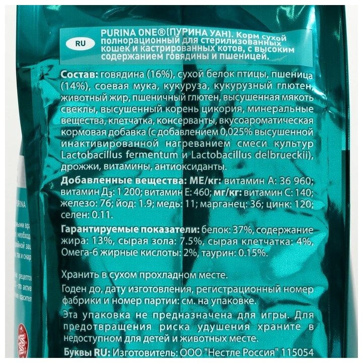 PURINA ONE 750 г сухой корм для стерилизованных кошек и кастрированных котов, с высоким содержанием говядины
