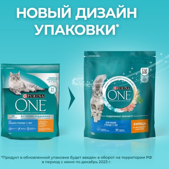 Сухой корм Purina ONE для кошек старше 11 лет с курицей и цельными злаками, Пакет, 750 г,Для взрослых кошек старше 11 лет
