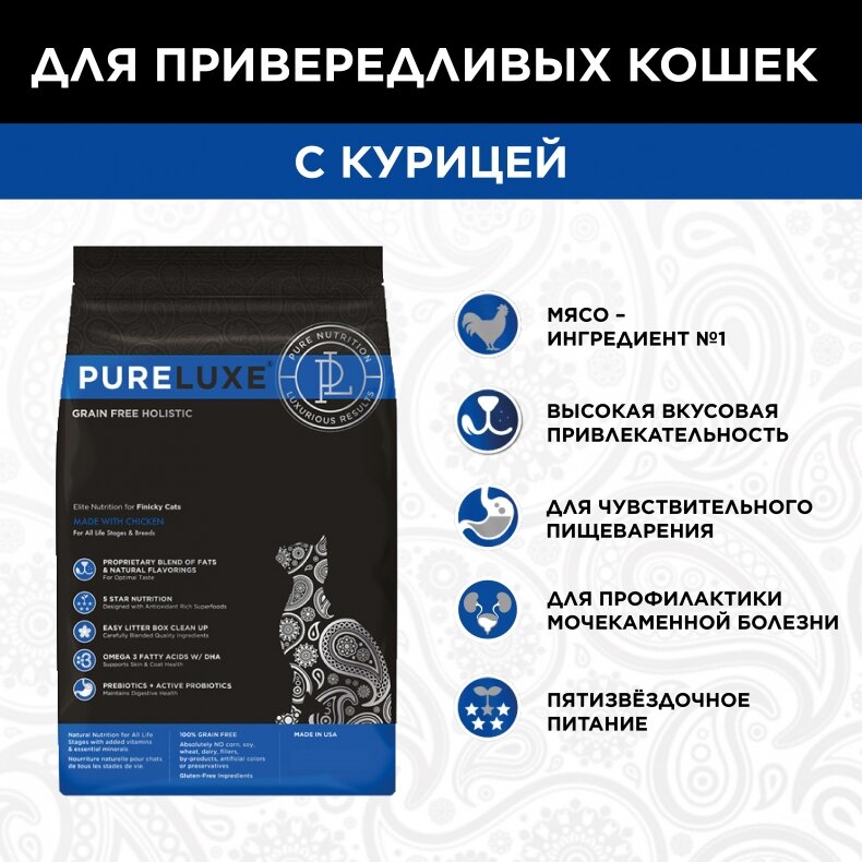 PURELUXE элитное питание беззерновой для привередливых взрослых кошек с курицей (1,5 кг)