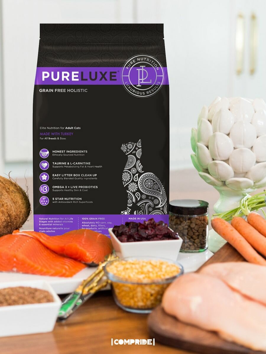 Сухой корм для кошек PureLuxe Пурлюкс беззерновой корм класса холистик для взрослых кошек всех пород и размеров со свежей индейкой , 1,5 кг.