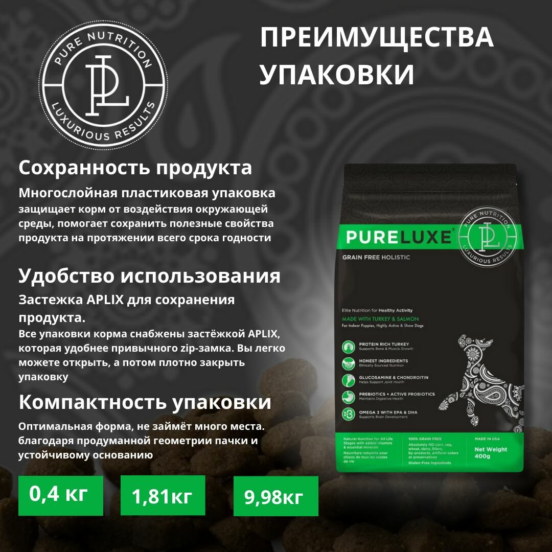 Купить Корм сухой беззерновой класса холистик PureLuxe Пурлюкс для щенков, активных и выставочных собак всех пород, со свежей индейкой и лососем, 400 гр.