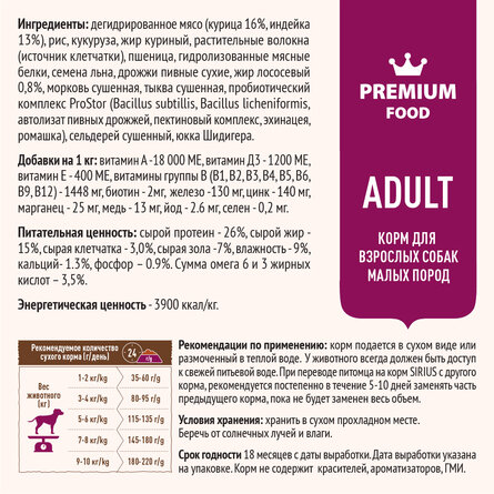 SIRIUS для взрослых собак маленьких пород с индейкой (2 + 2 кг)