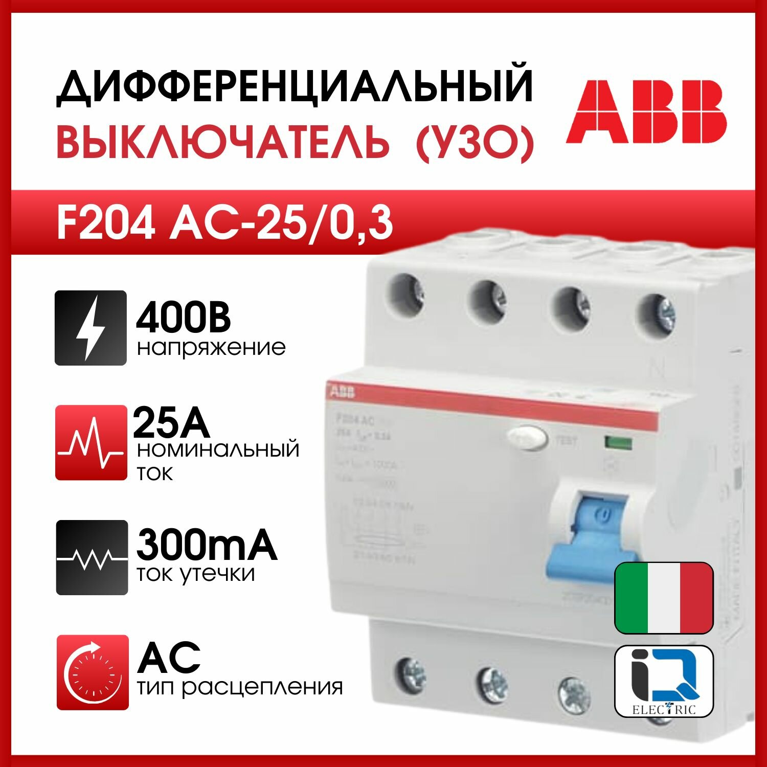 Устройство защитного от клавишный F204 AC-25/0,3 (тип АС) 25А-300мА 230/400В 3Р+N 6кА 2CSF204001R3250 (АВВ