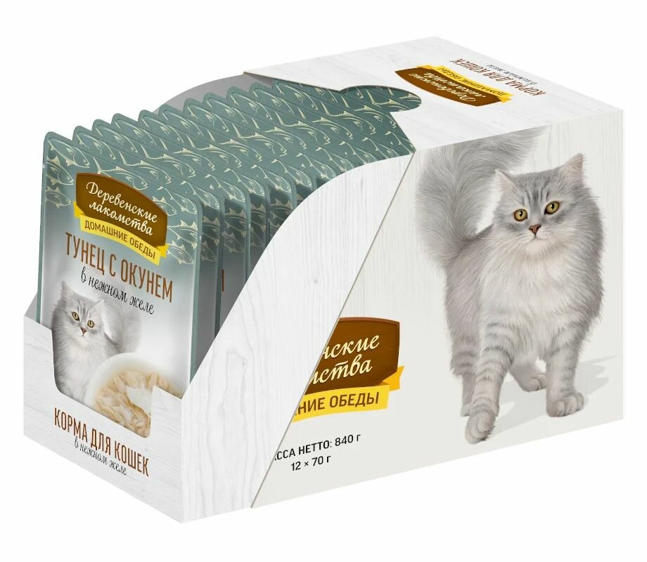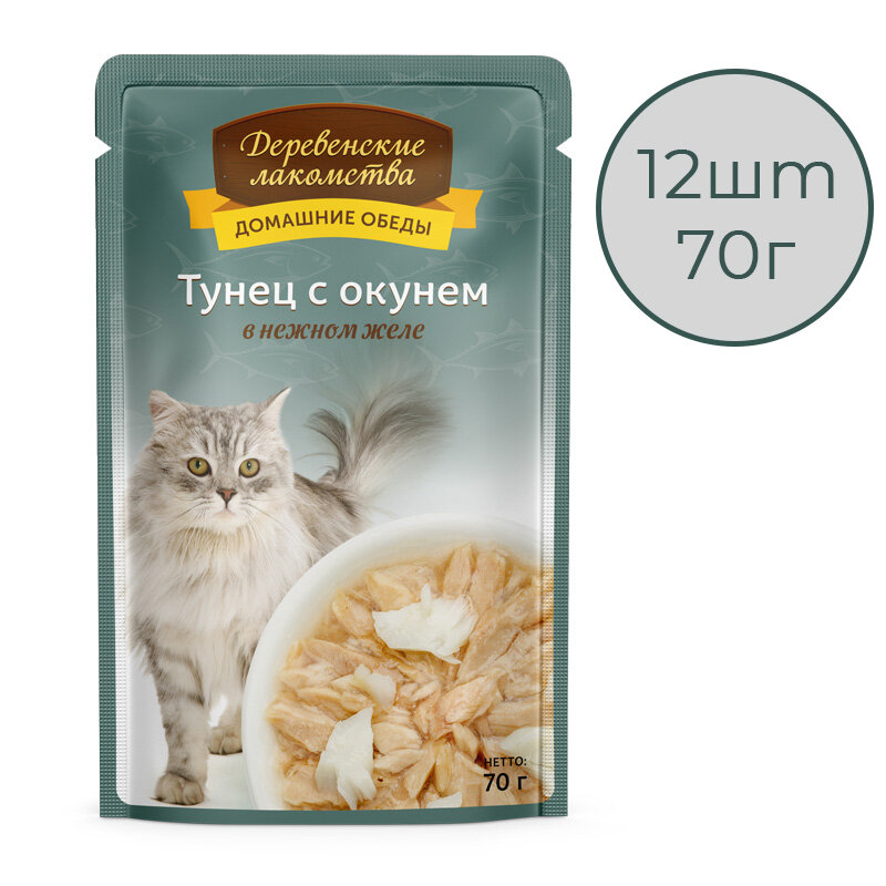 Купить Корм Деревенские лакомства "Тунец с окунем в нежном желе" (консерв.) для кошек, 70 г x 12 шт