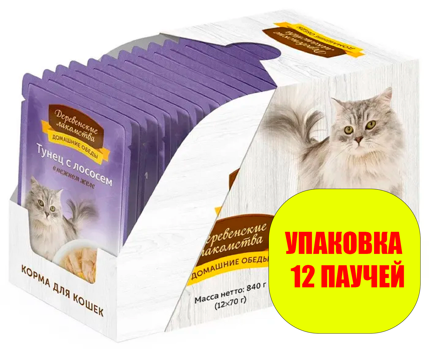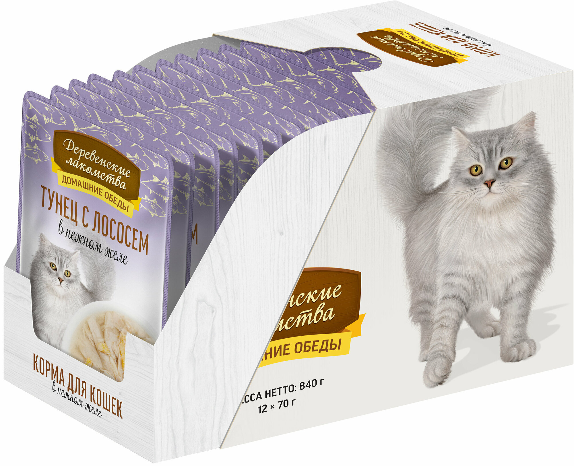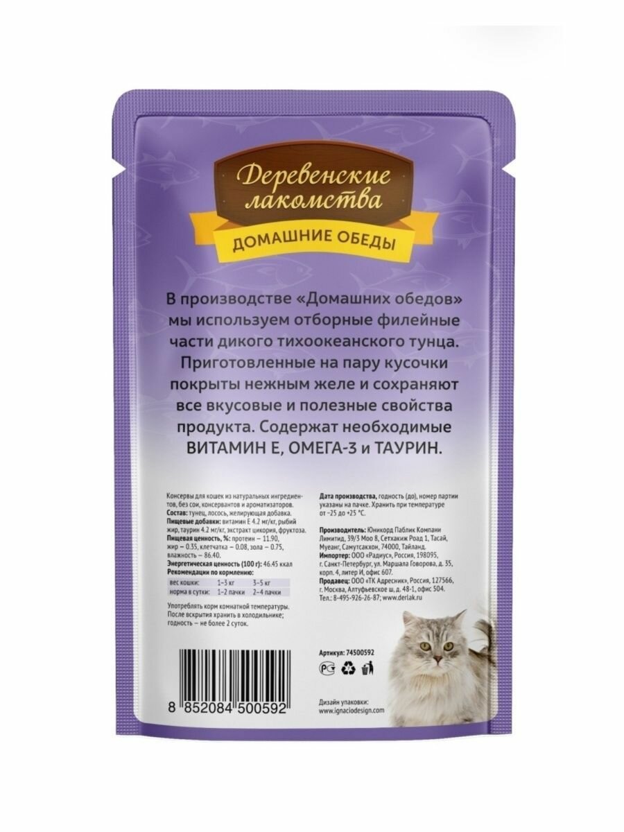 Деревенские лакомства пауч для кошек (кусочки в нежном желе) Тунец и лосось, 70 г. упаковка 12 шт