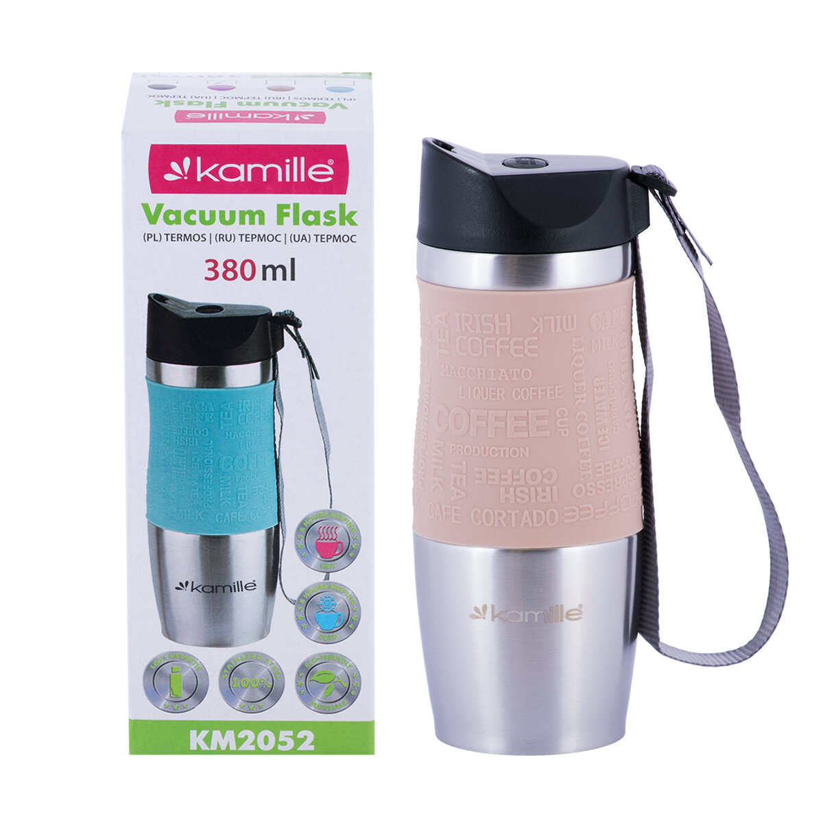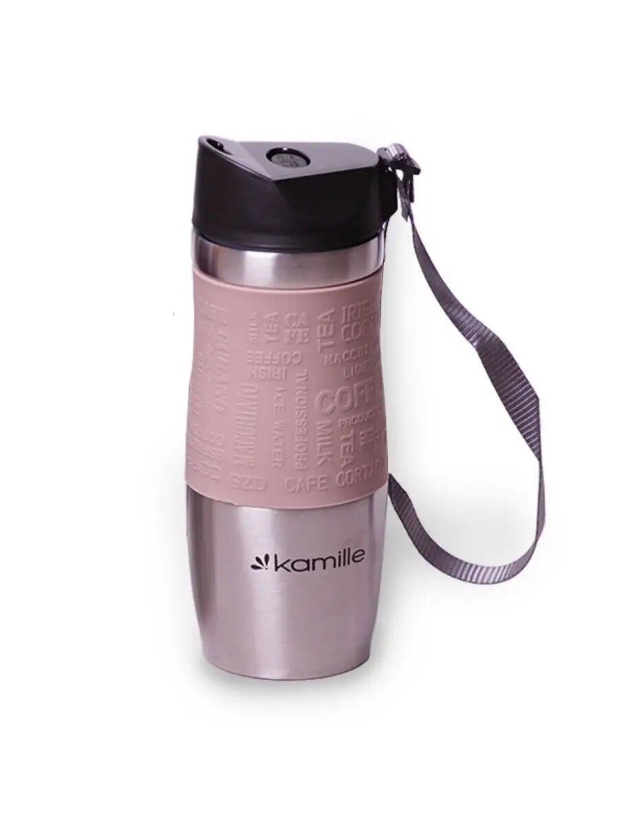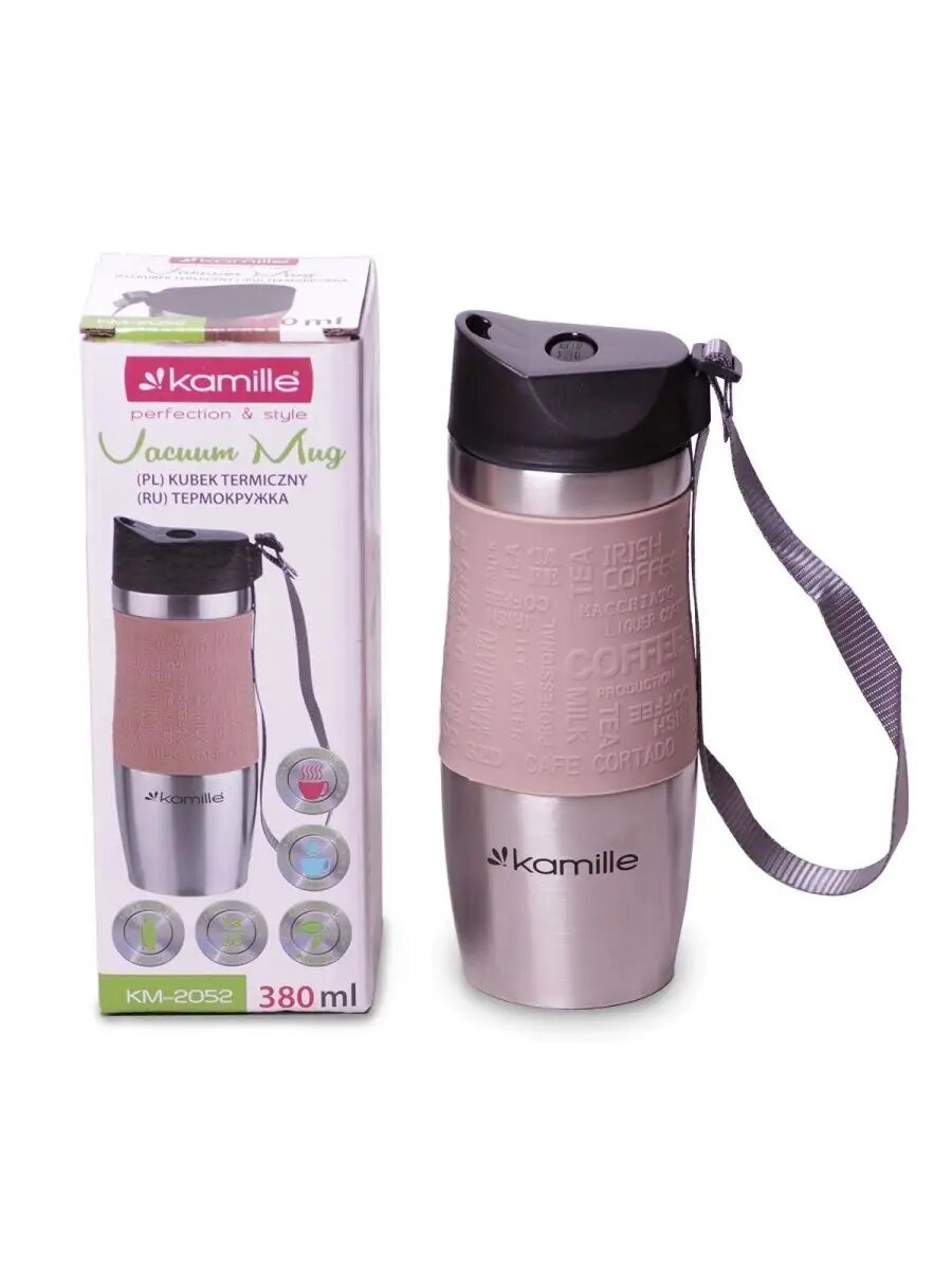 Термокружка 380мл Kamille KM-2052 из нержавеющей стали с TPR-вставкой и ремешком