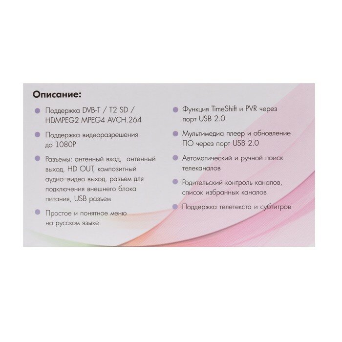 | Плюсы: | Простота настройки ! Подключил к телевизору Самсунг 2004 года картинка просто класс ! подключал через тюльпан купил в ДНС все хорошо ! Поймал 10 каналов на обычную антену без усилений |
