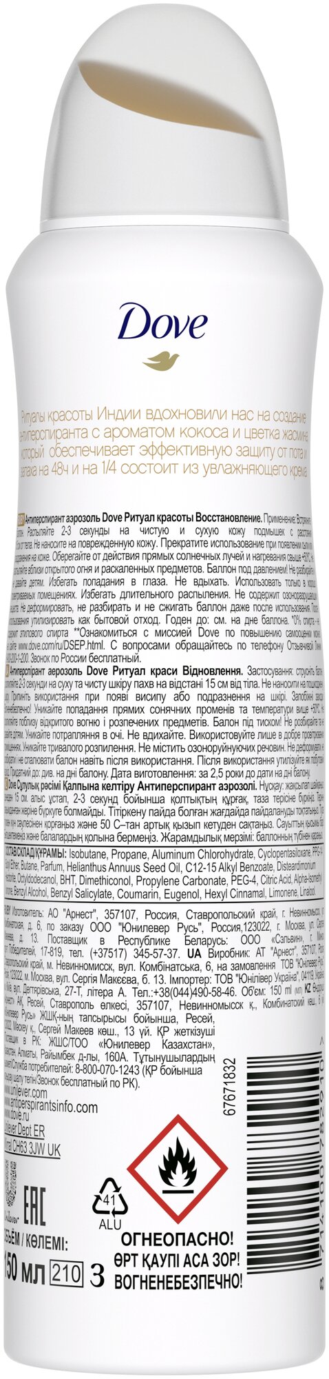 Купить Дезодорант-антиперспирант спрей женский DOVE Ритуал красоты Восстановление с ароматом кокоса и цветка жасмина, 150мл, Россия, 150 мл
