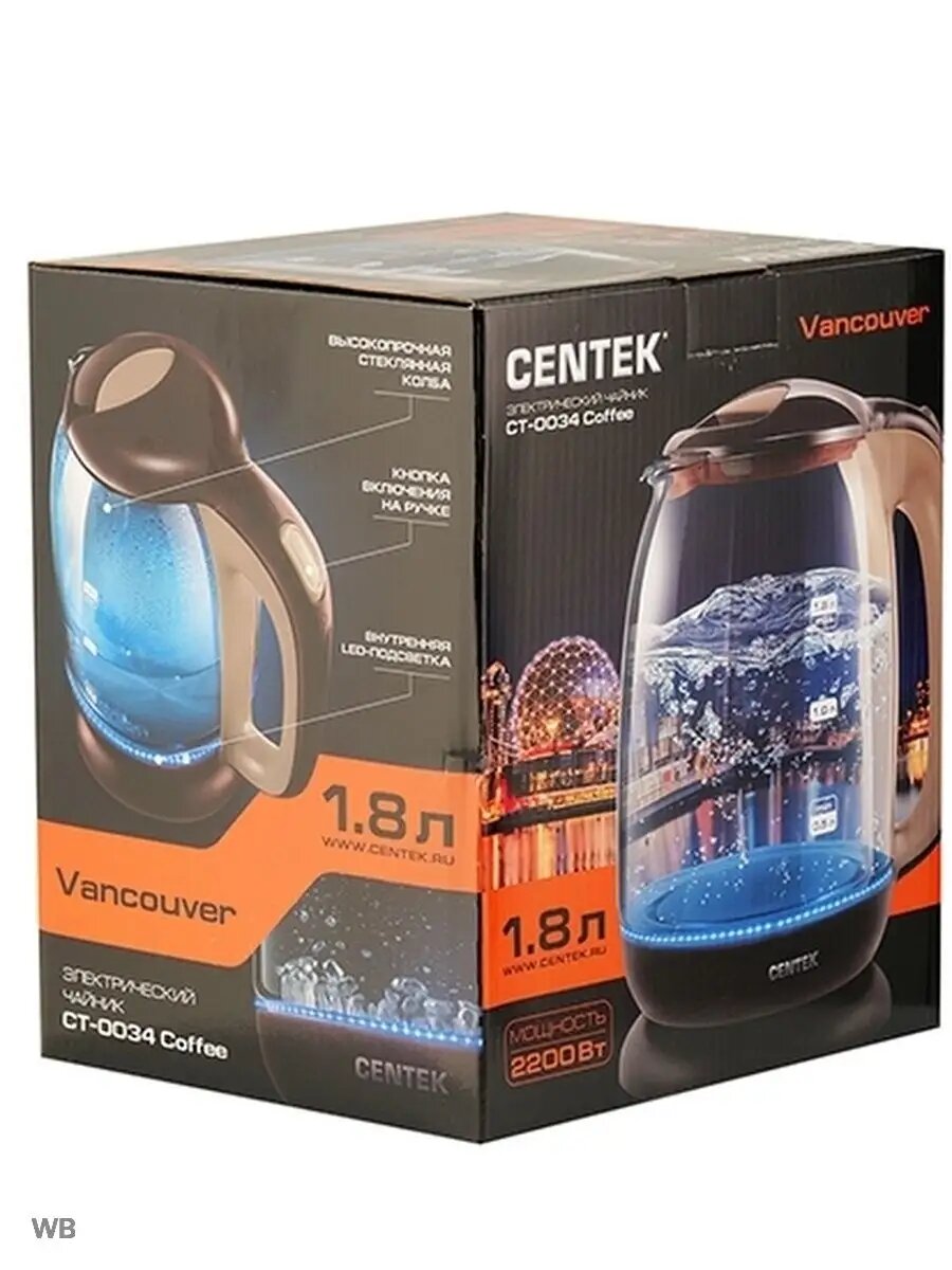 Чайник CENTEK CT-0034 Coffee Vancouver (1.8л, стекло, LED-подсветка)