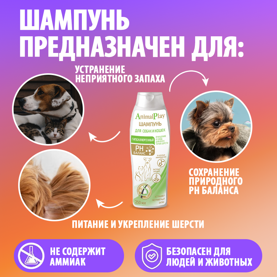 Шампунь для собак и кошек, склонных к аллергии, зуду Animal Play гипоаллергенный, 250 мл