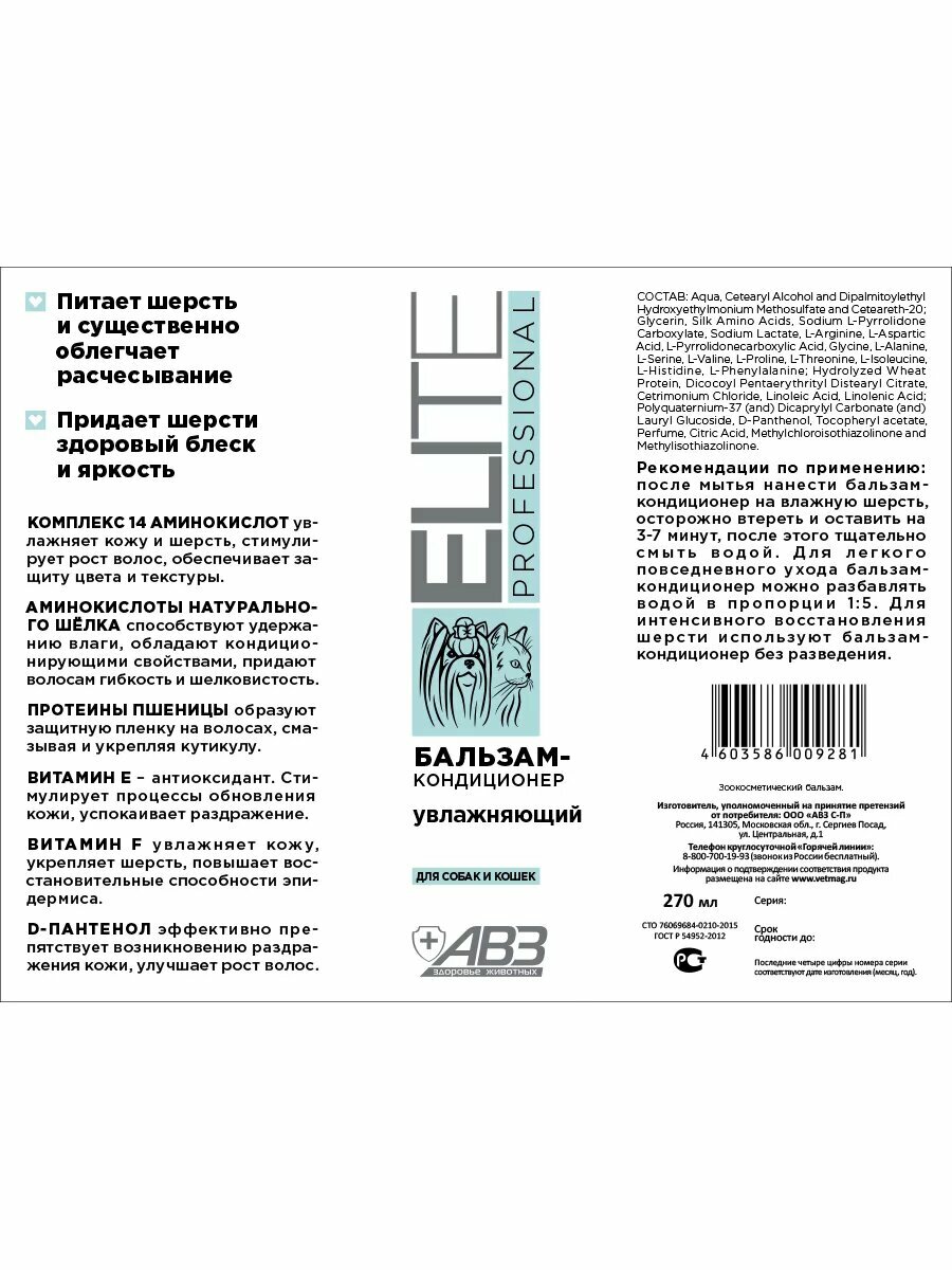 Elite Professional АВЗ (Агроветзащита) бальзам-кондиционер для собак и кошек, увлажняющий, 270 мл