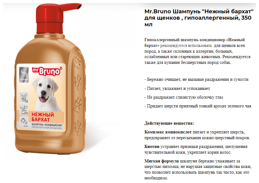 Шампунь Mr. Bruno Нежный бархат Mr.Bruno для щенков, 350 мл