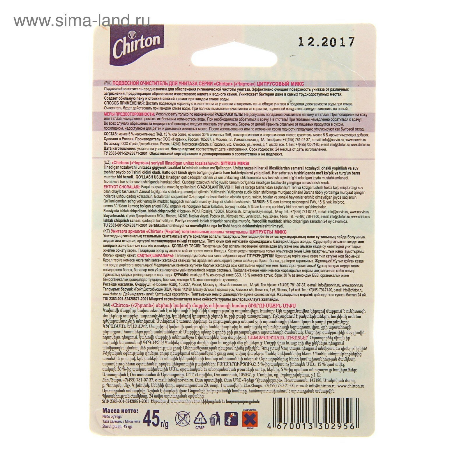 Ниже Вы можете прочитать отзывы на Подвеска для унитаза Chirton, Цитрусовый микс, 45 г, ознакомится с подробными характеристиками, посмотреть интересные обзоры и фотографии на Подвеска для унитаза Chirton, Цитрусовый микс, 45 г.