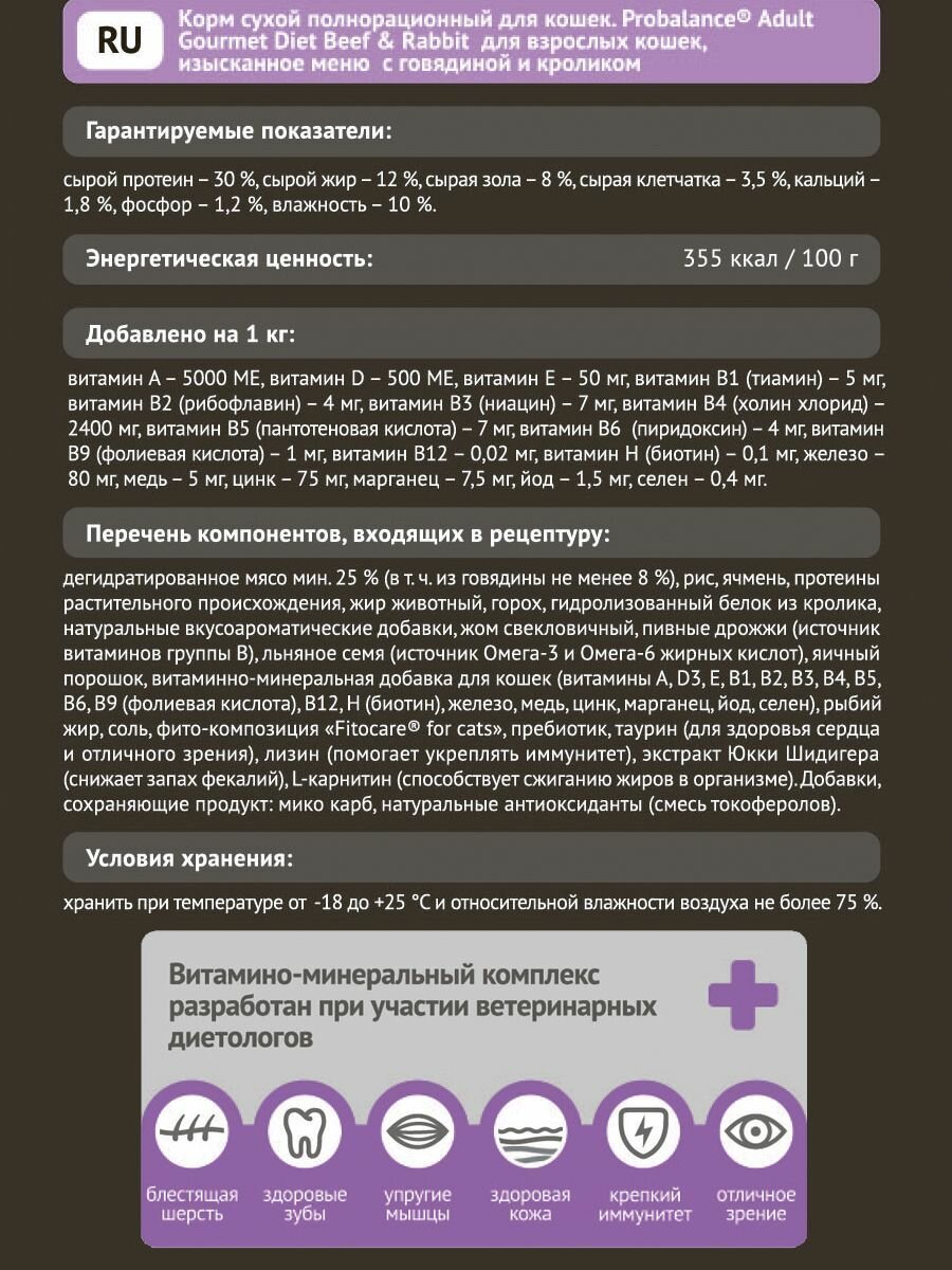 Купить Probalance Корм сухой для кошек с говядиной и кроликом Gourmet Diet 1,8 кг 38 PB 313 1,800 кг 65521 (1 шт)