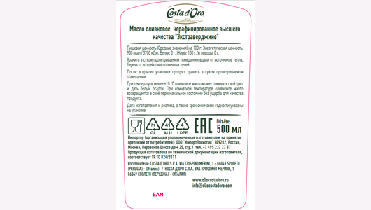 Масло оливковое нерафинированное "Коста Дора", 500мл