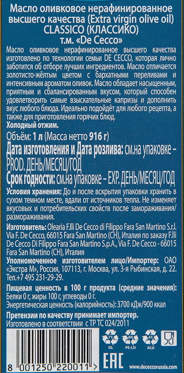 Ниже Вы можете прочитать отзывы на Масло DE CECCO CLASSICO оливковое Extra Vergine нерафинированное 1л, ознакомится с подробными характеристиками, посмотреть интересные обзоры и фотографии на Масло DE CECCO CLASSICO оливковое Extra Vergine нерафинированное 1л.