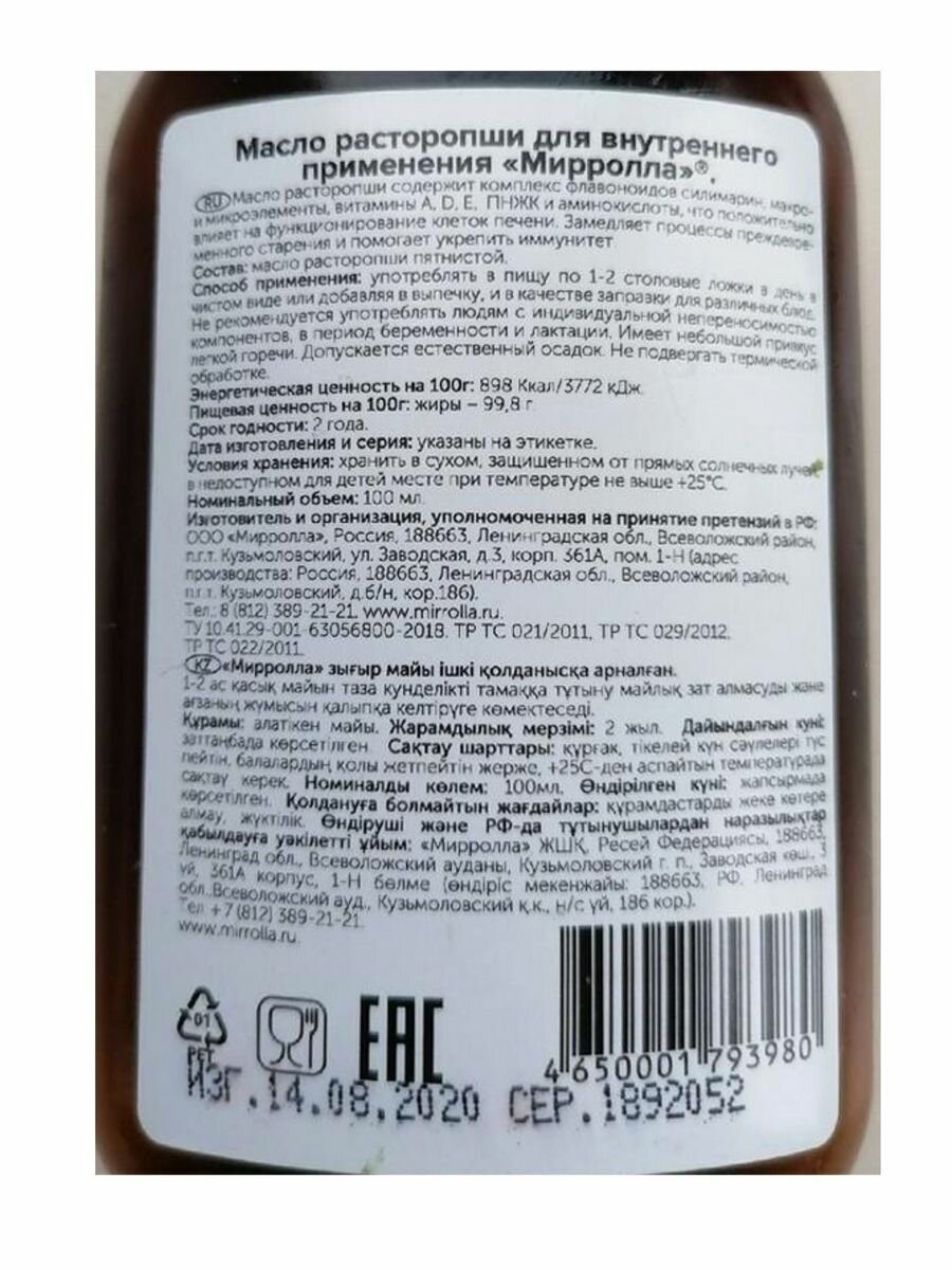Масло расторопши пищевое Mirrolla 100 мл. 4241255