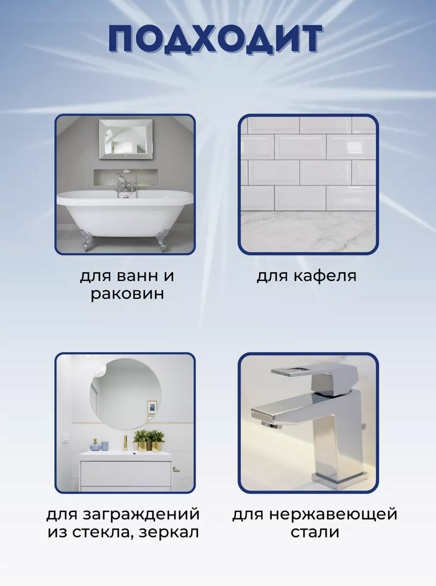 | Плюсы: | Очень хорошие средство. Необыкновенно хорошо удаляет белый налет на смесителе. Достаточно попшикать, подождать минуту, как рекомендует производитель, и вытереть сухой салфеткой. И вуаля. Блестит, как новое. Рекомендовала средство друзьям и соседям. Все очень довольны и заказывали средство не по одному разу. Рекомендуем и вам!!! |