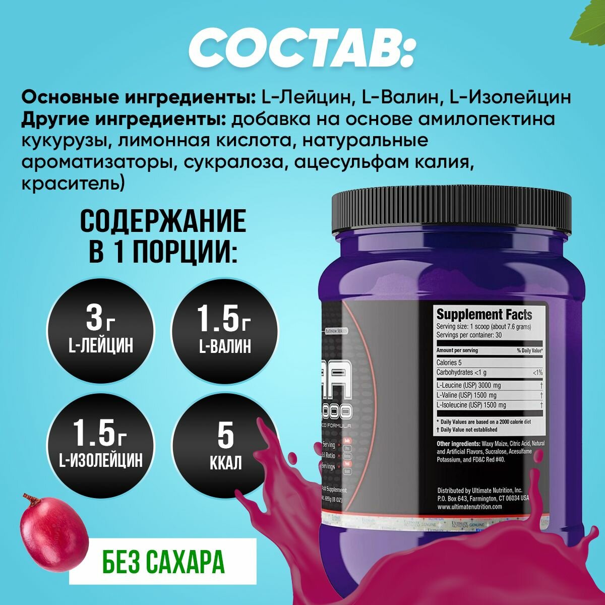 СохранитьBCAA Ultimate Nutrition BCAA Powder 12000, виноград, 228 гр. интересное:
