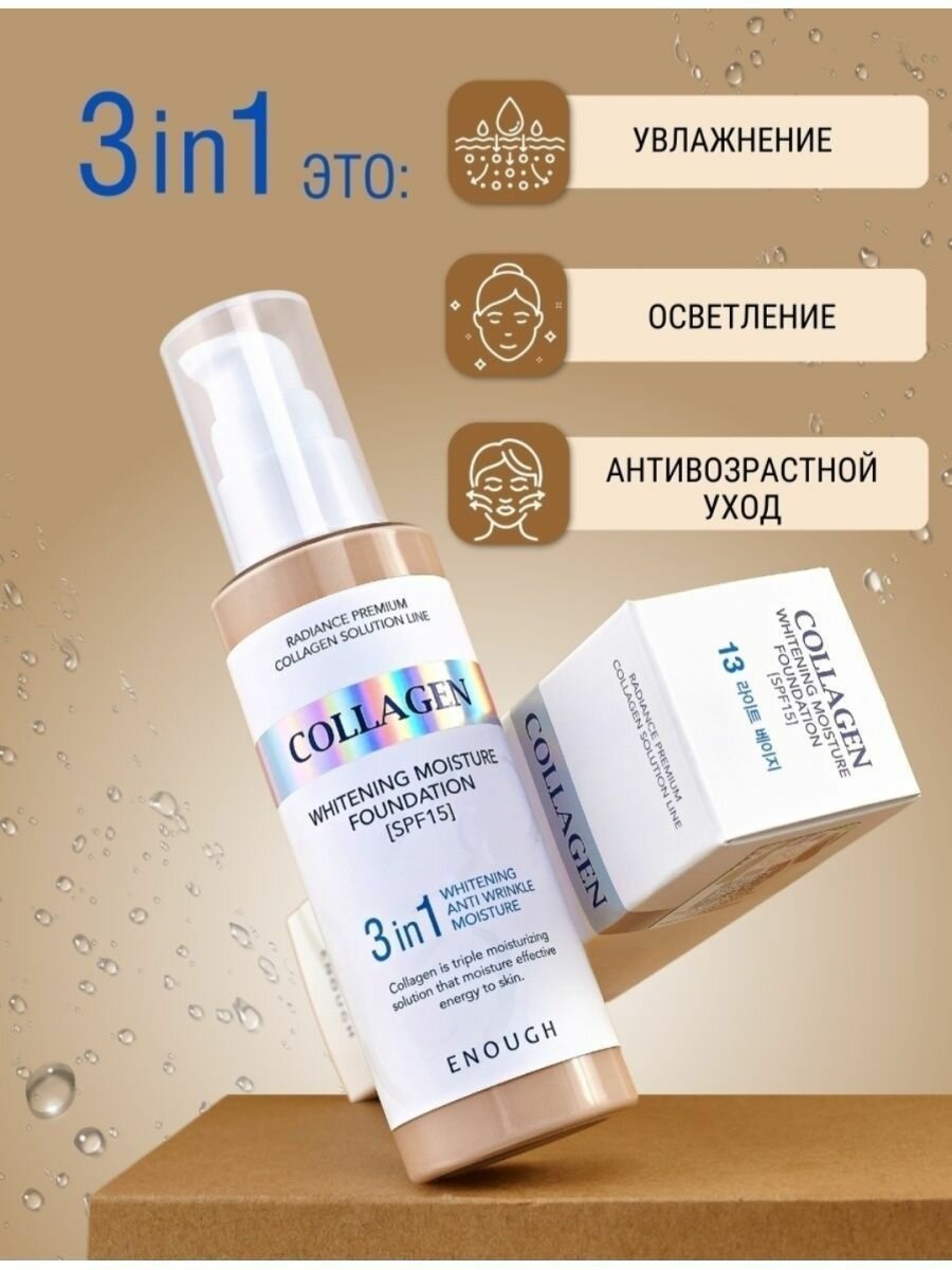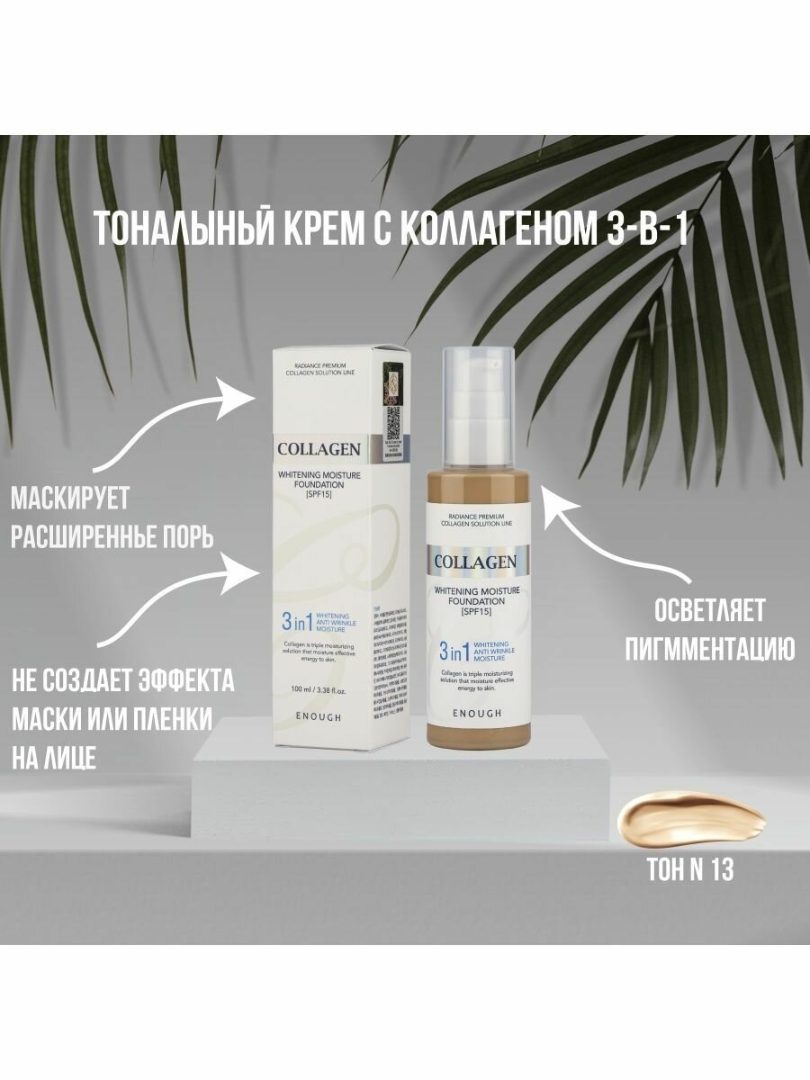 Осветляющий тональный крем для лица ENOUGH 3в1 с колагеном, SPF15 тон 13, 100 мл