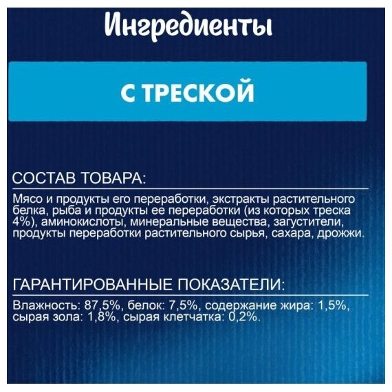| Отзыв: | Мой кот любит такую штуковину. Состав нормальный, запах тоже. Обычно делю влажный корм на две части: утром/вечером. Этот даю весь сразу, пакетик маловат. |