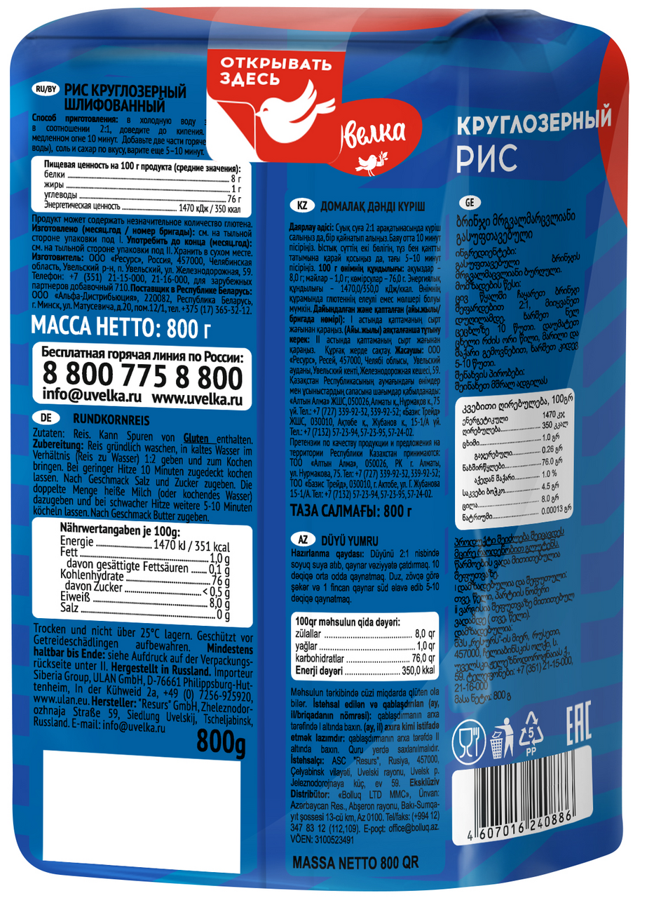Рис "Увелка" круглозерный шлифованный отборный 800 г интересное: