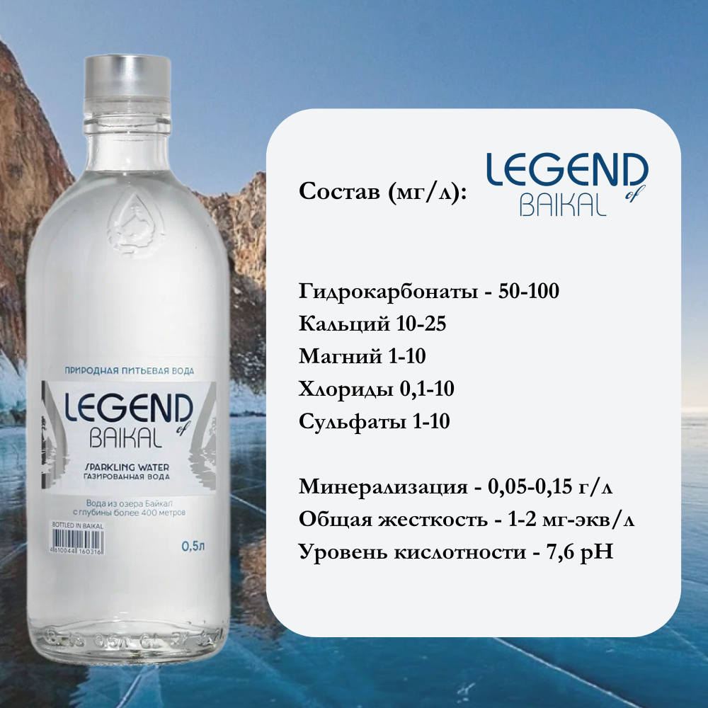 СохранитьВода питьевая Legend of Baikal (Легенда Байкала), 0,5 л х 8 шт, газированная, стекло интересное: