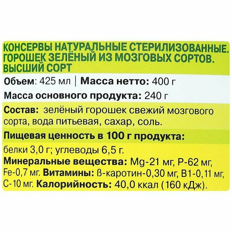 Горошек зелёный 6 соток, жестяная банка, 400 г, 420 мл, 9 шт.