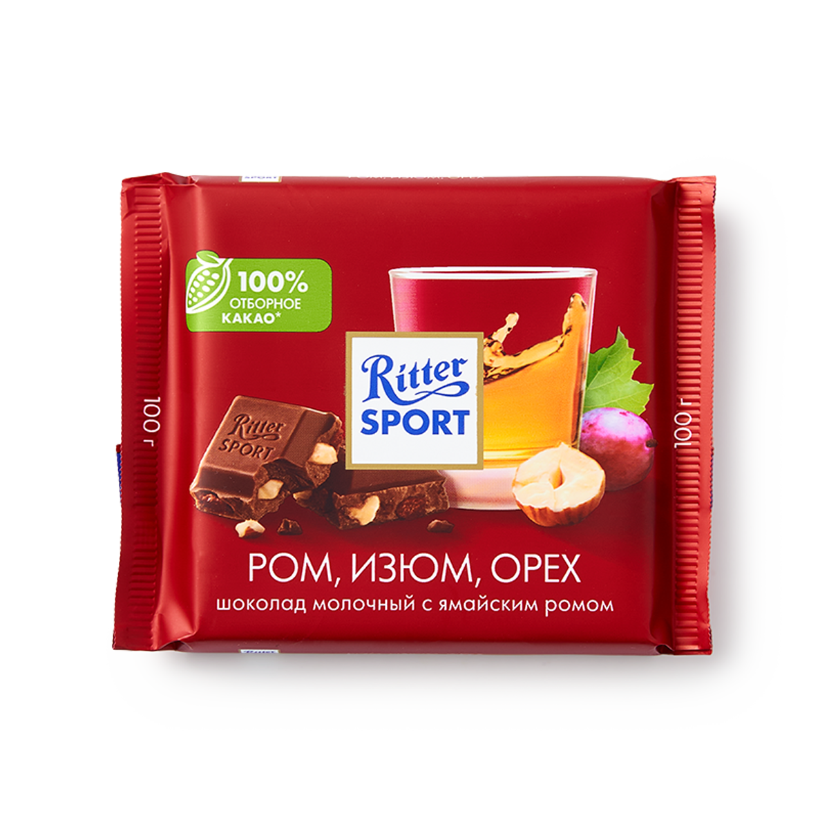 Шоколад молочный RITTER SPORT ямайский ром/орех/изюм, 100г