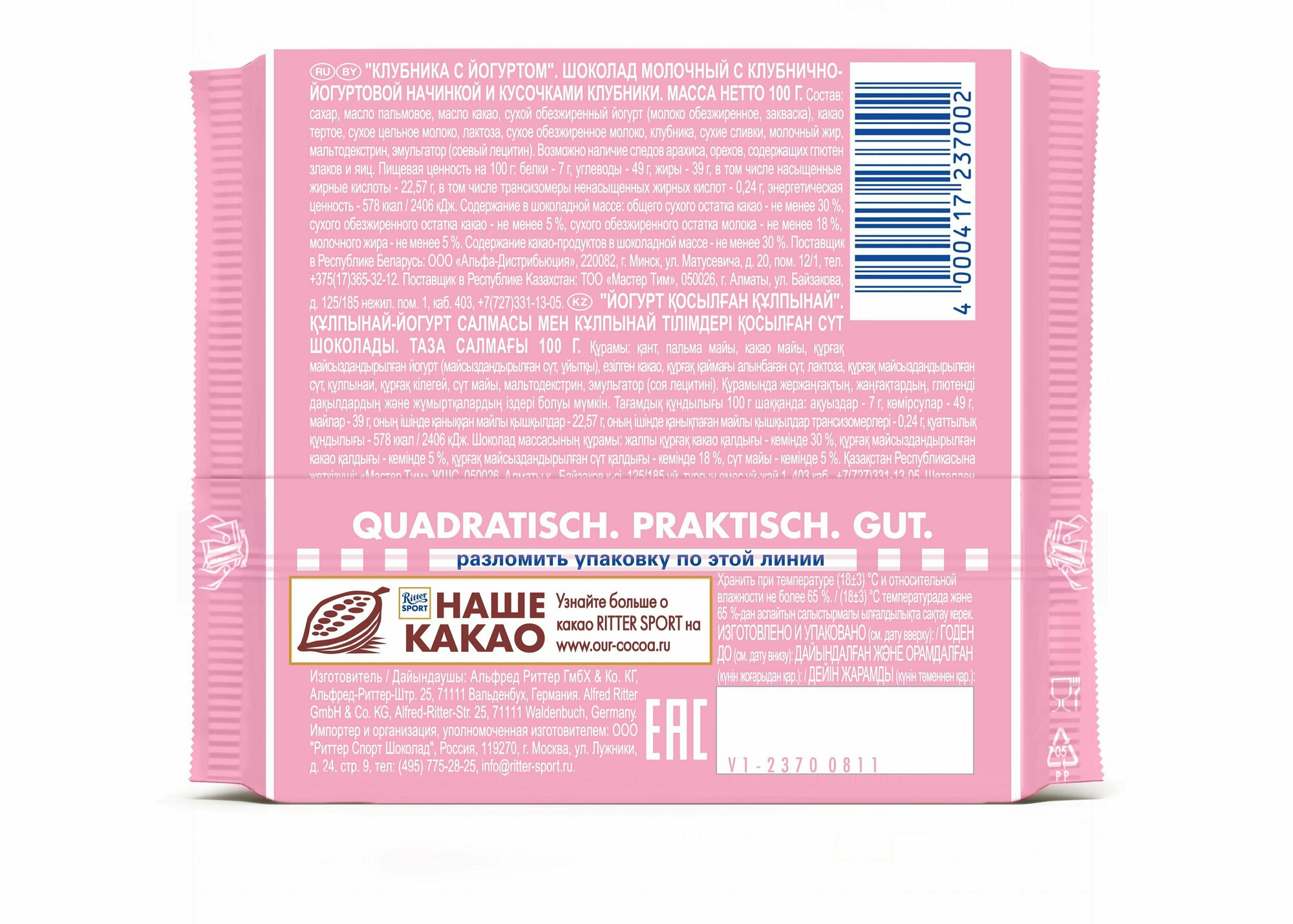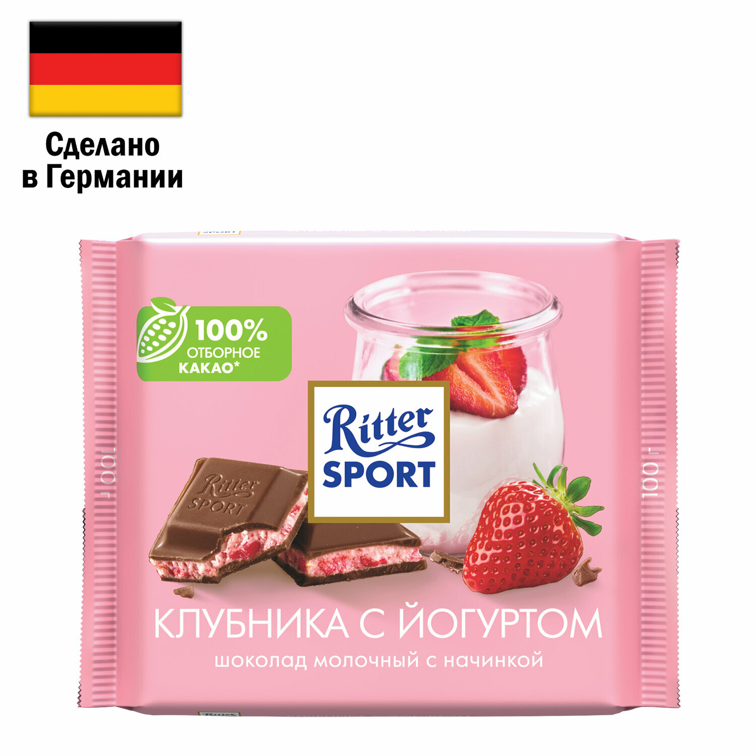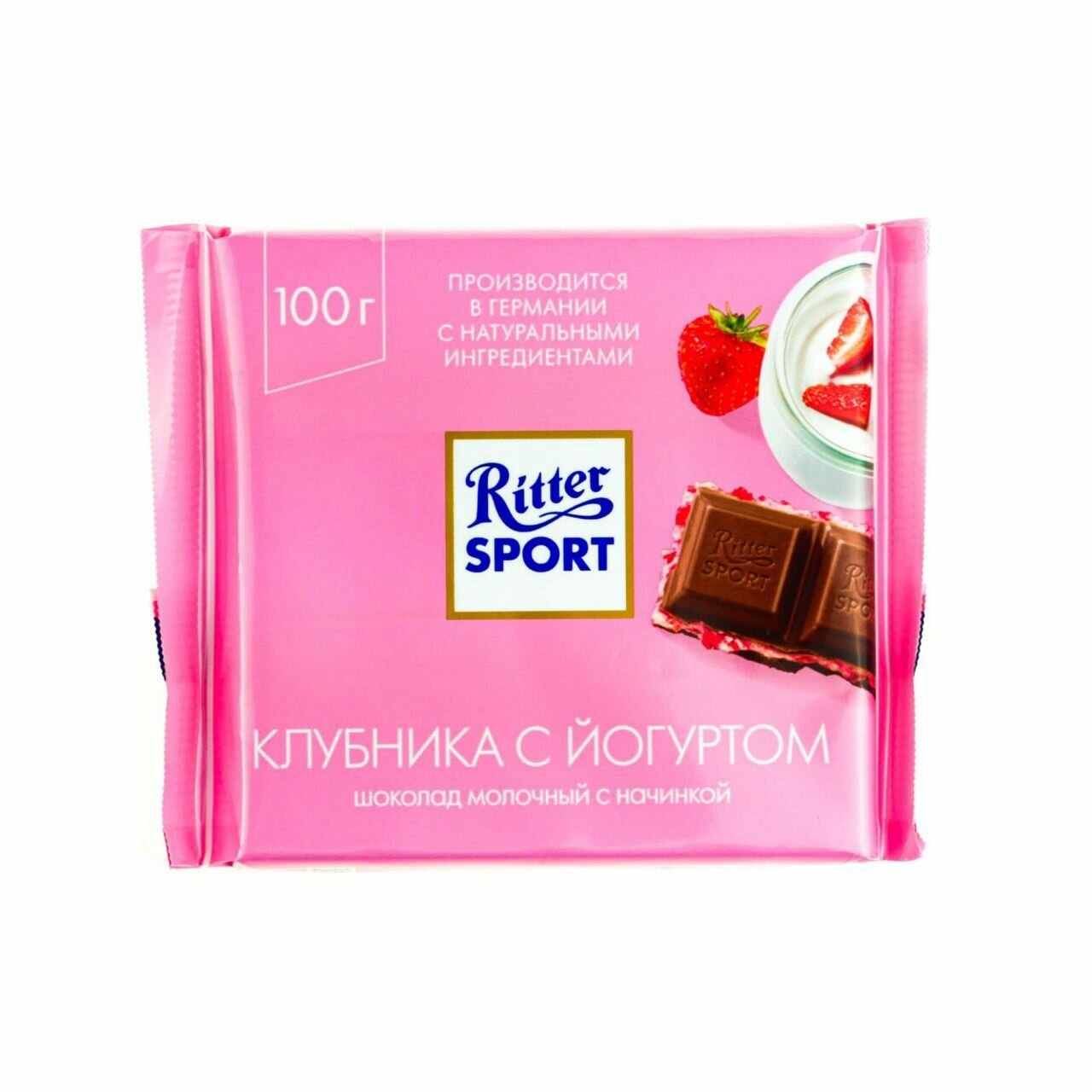 Шоколад RITTER SPORT "Клубника с йогуртом", молочный с начинкой, 100 г, Германия, RU2376
