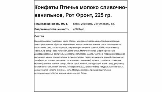 Ниже Вы можете прочитать отзывы на Конфеты Рот Фронт - Птичье молоко (сливочно-ванильные) 225 г, ознакомится с подробными характеристиками, посмотреть интересные обзоры и фотографии на Конфеты Рот Фронт - Птичье молоко (сливочно-ванильные) 225 г.