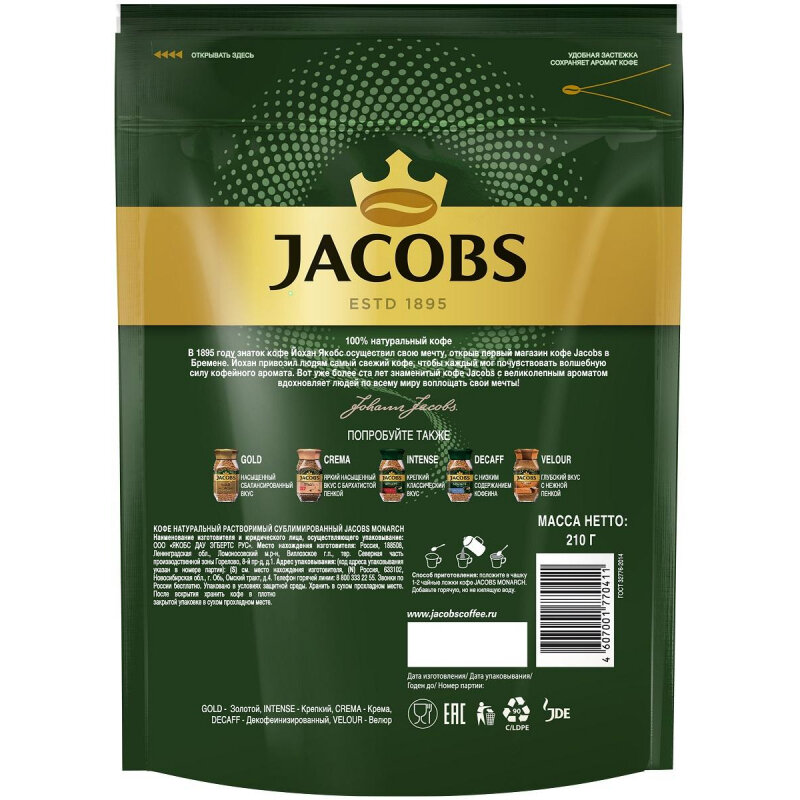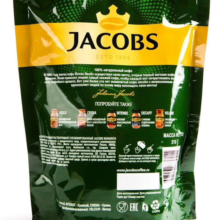 Кофе растворимый JACOBS "Monarch", сублимированный, 210 г, мягкая упаковка, 8052808