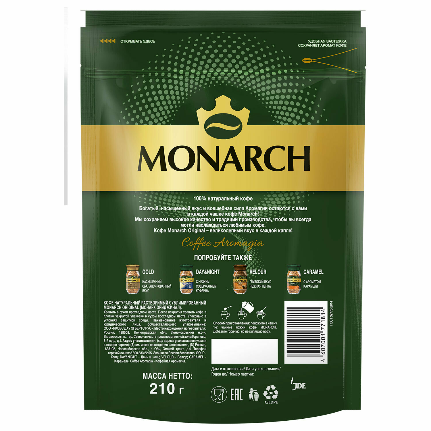 Кофе растворимый MONARCH ORIGINAL сублимированный, пакет, 210 г