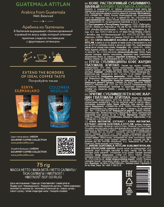 Кофе Jardin Guatemala Atitlan сублимированный,150г пакет