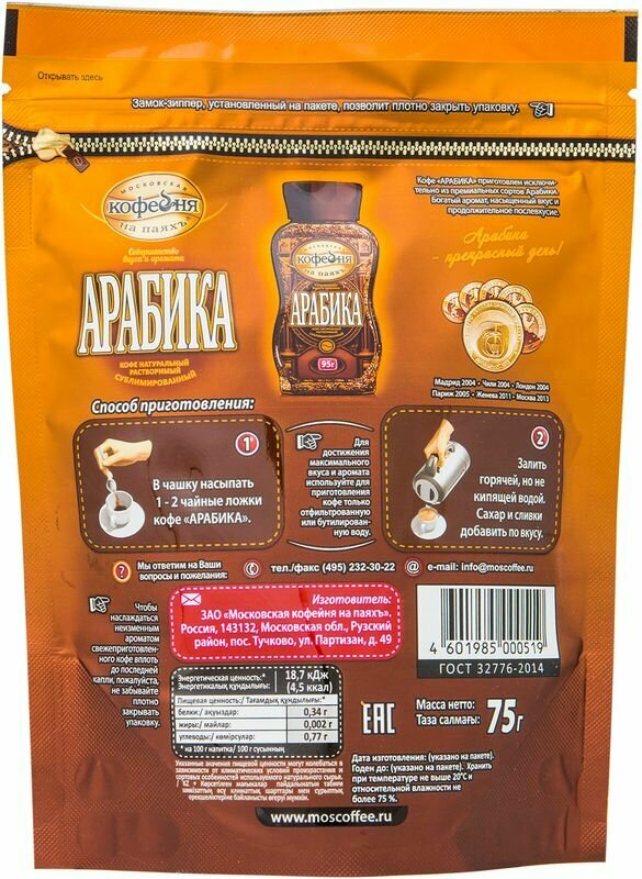 Московская кофейня на паяхъ Арабика кофе рaстворимый, пакет 75 г