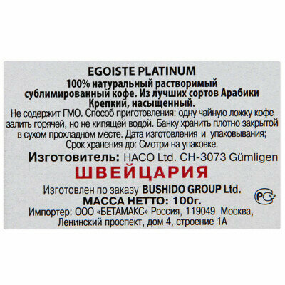 Кофе растворимый EGOISTE "Platinum", сублимированный, 100 г, 100% арабика, стек.банка